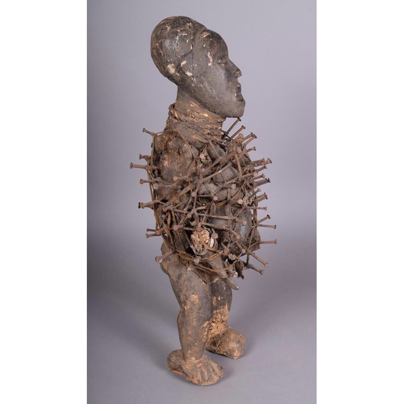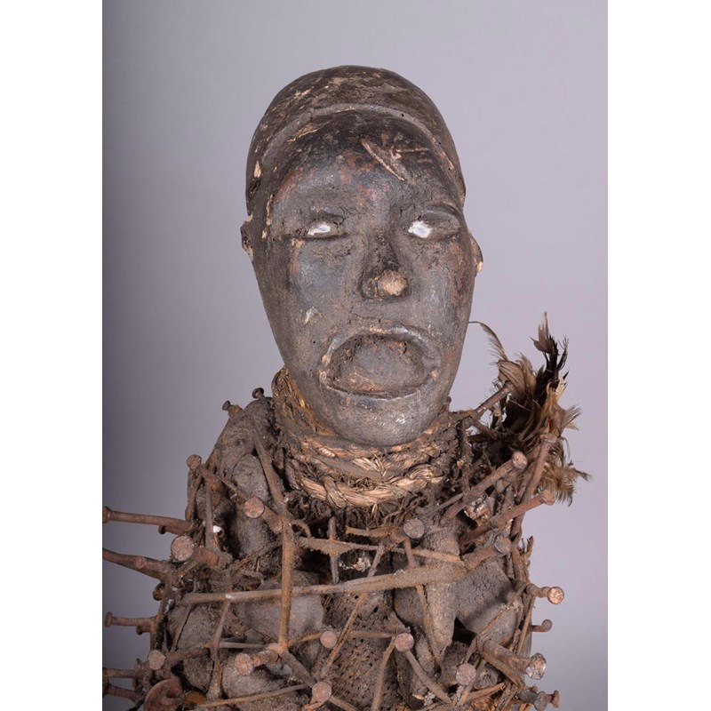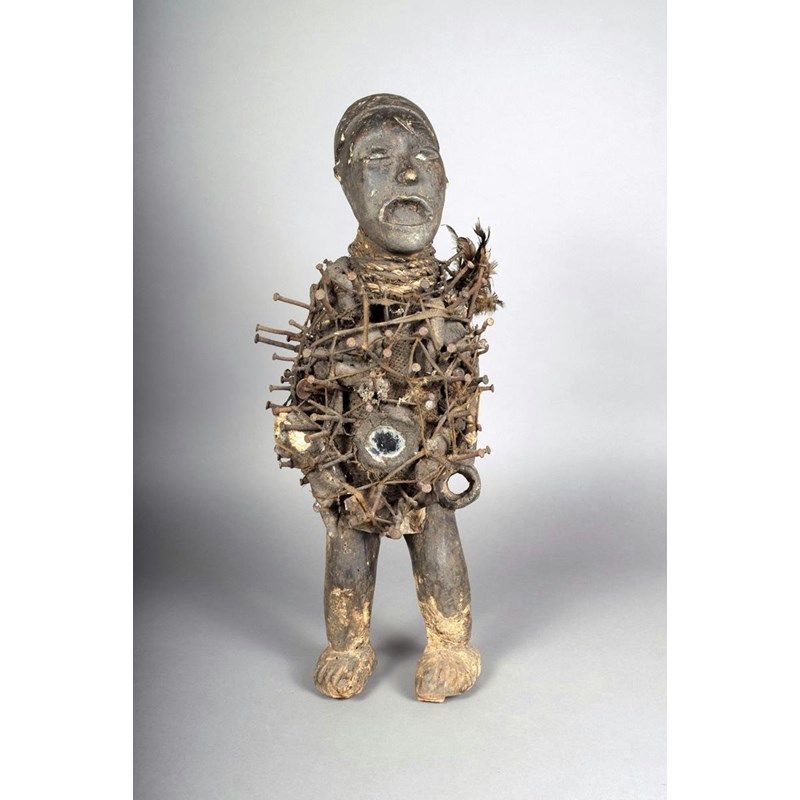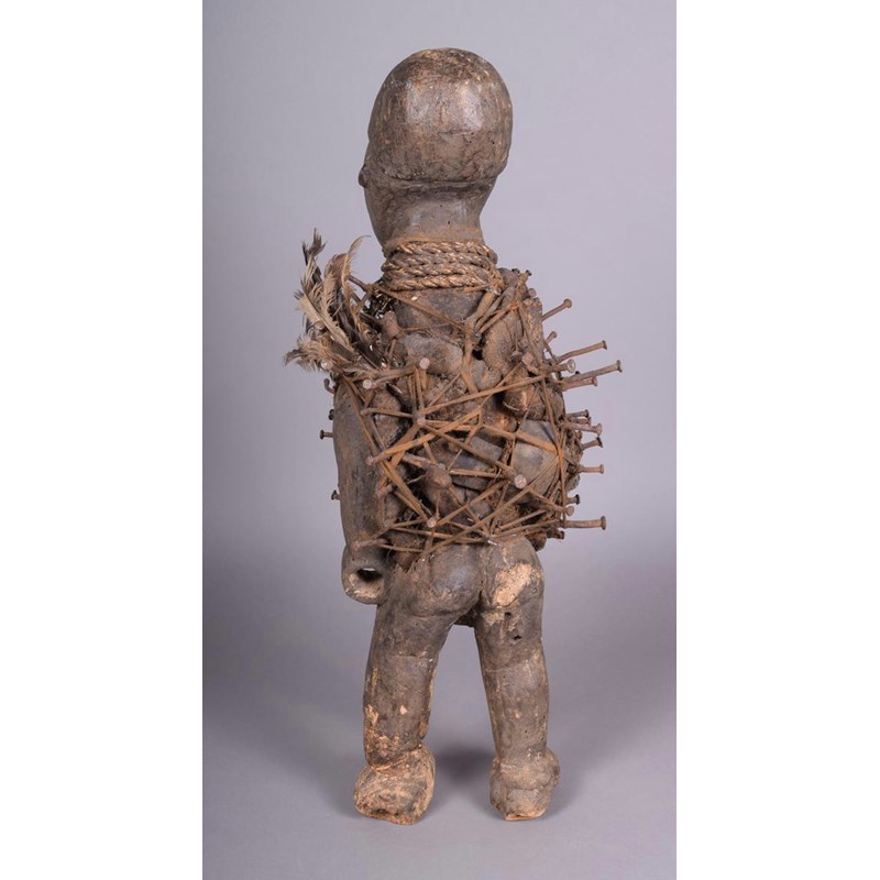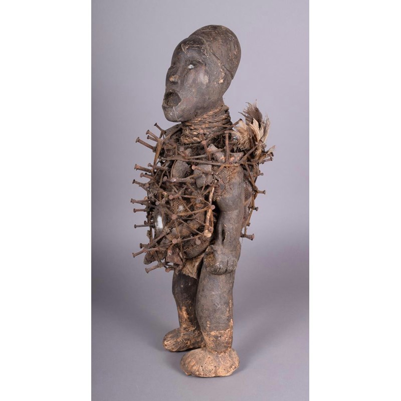 A Congo standing fetish figure, with cloth, nails, fibre, feathers, bone and an inset mirror to the abdomen and eyes, 61cm high.
