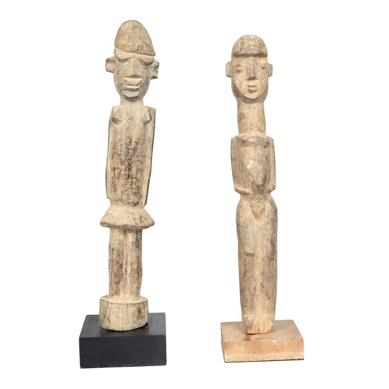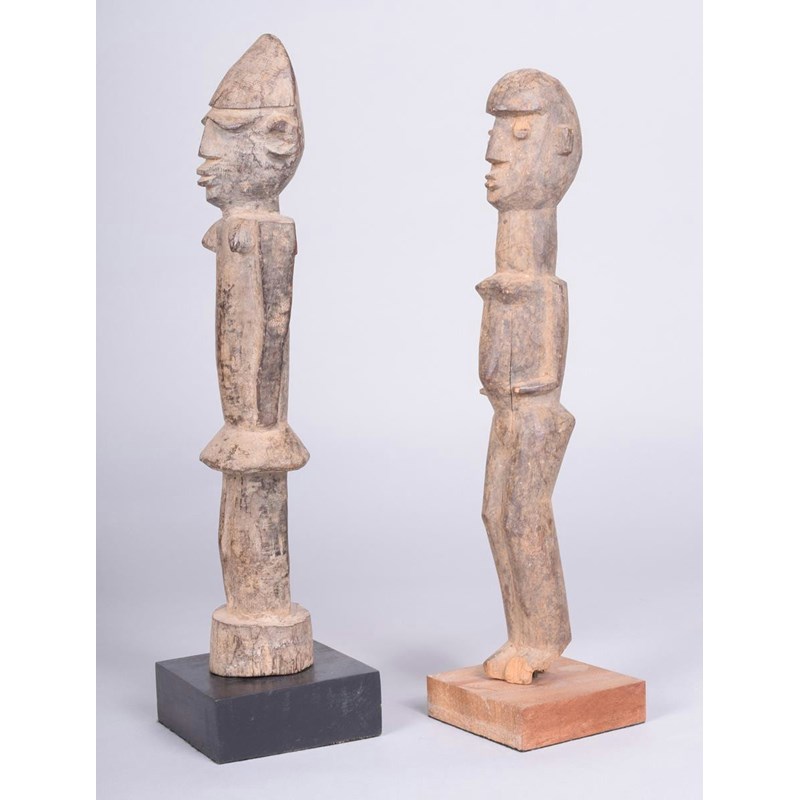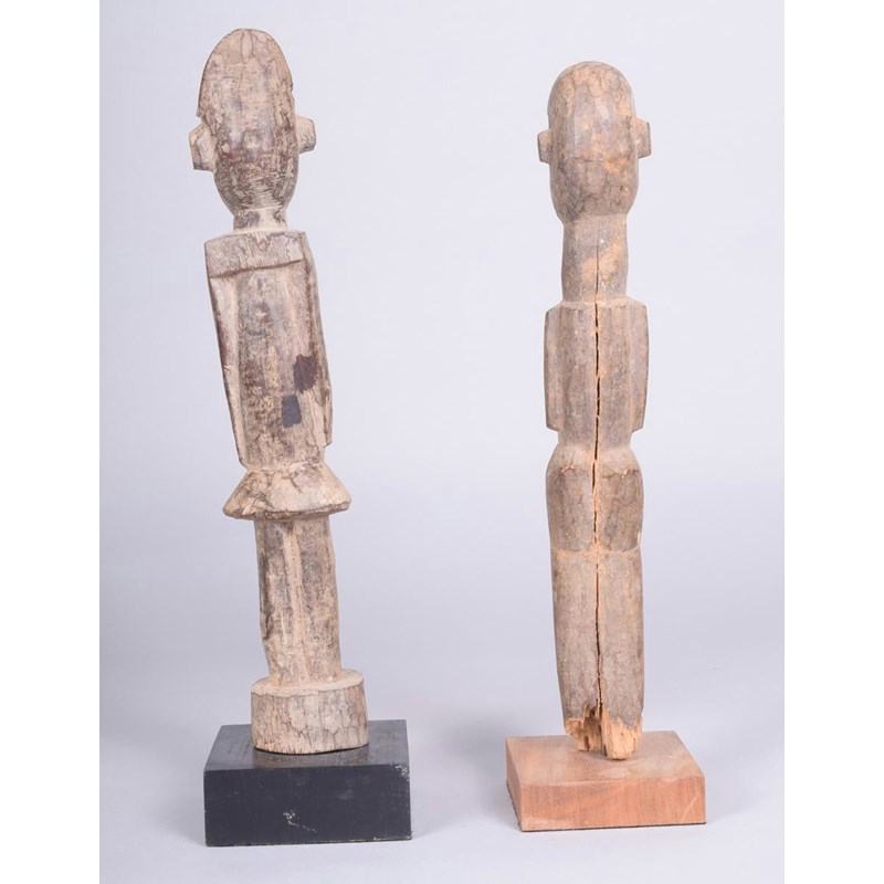 A Lobi standing female figure, Burkina Faso, with angled arms and bent legs, 34cm high on a stand and a Lobi standing figure with short skirt, 35.5cm high, on a stand. (2)