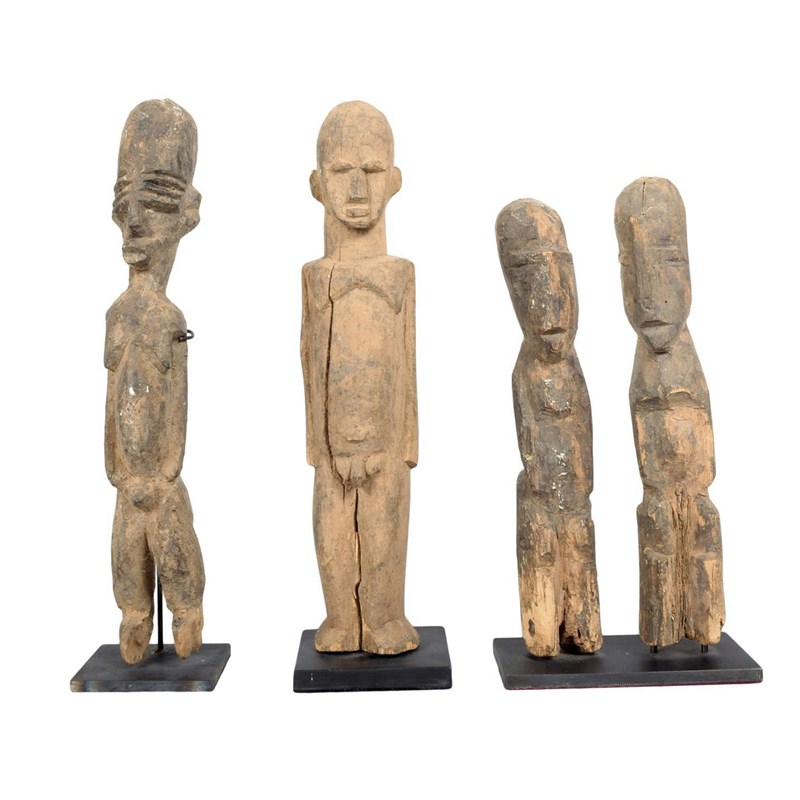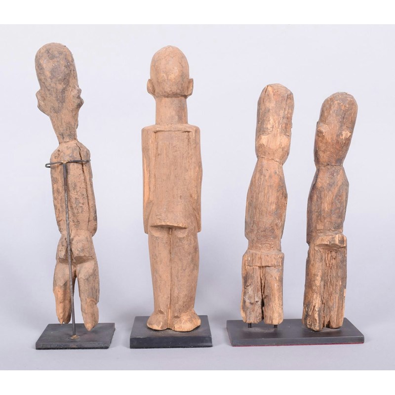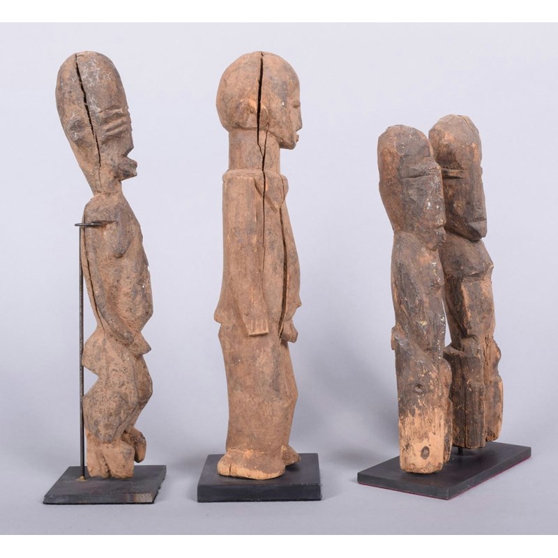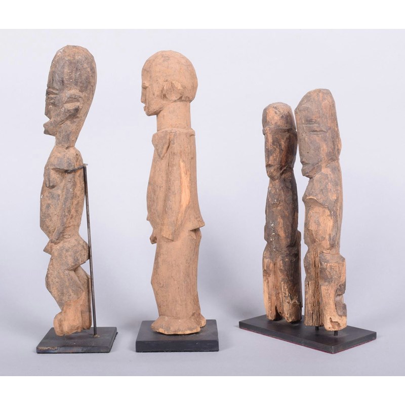 A Lobi standing male figure, Burkina Faso, the pose slightly twisted to the left, 25cm high, on a stand, a pair of Lobi standing figures, 21cm high, on a stand, a Lobi standing male figure, with termite degradation to the feet, 25cm high, on a stand. (4)