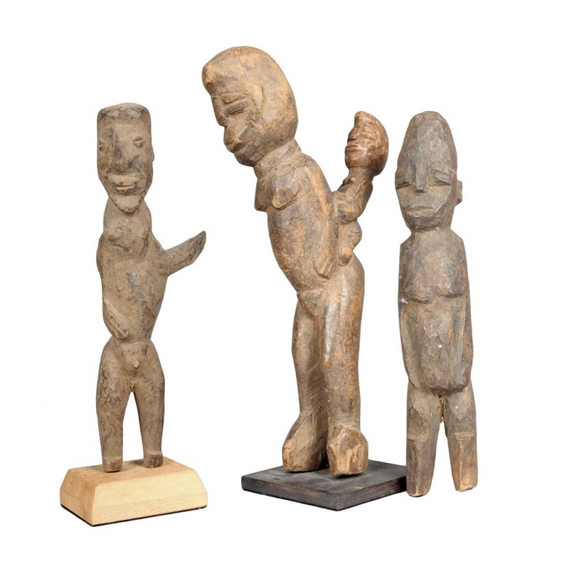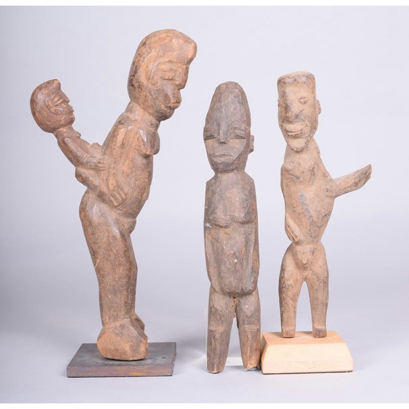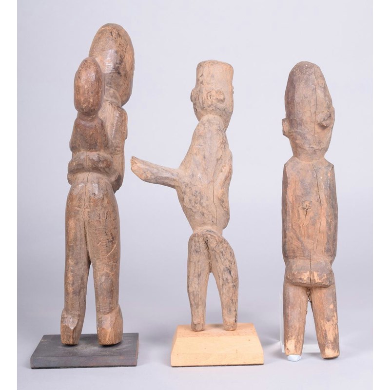 A Lobi standing male figure, Burkina Faso, with his left arm at right angles, 25.5cm high, on a stand, a Lobi maternal figure with a child on her back, 31.5cm high, on a stand, a Lobi standing male figure, 28cm high. (3)