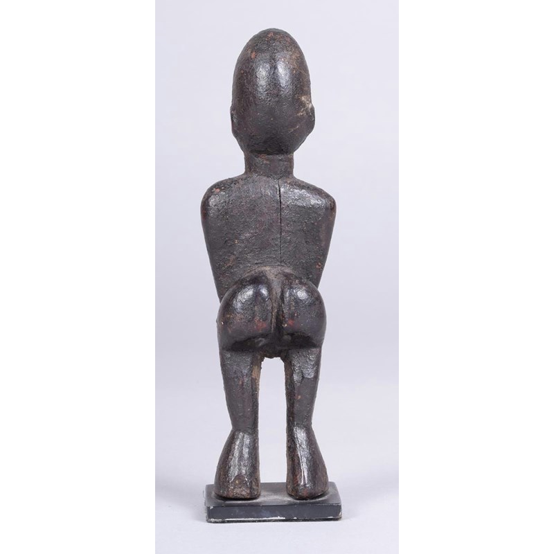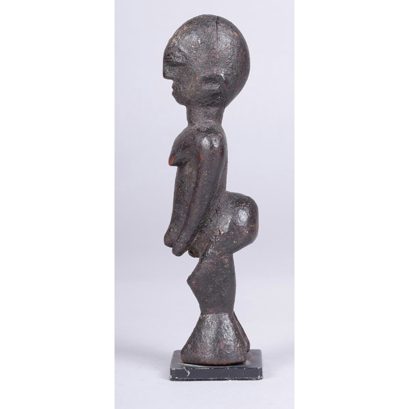 A Lobi standing figure, Burkina Faso, with encrusted patination, with straight arms squeezing his stomach, with high buttocks, 15.5cm high, on a stand.