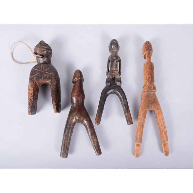 A Lobi catapult, Burkina Faso, with a standing male figure handle, 19cm high, a Lobi catapult with a phallic handle, a Dogon catapult with a seated figure handle and a Lobi heddle pulley. (4)