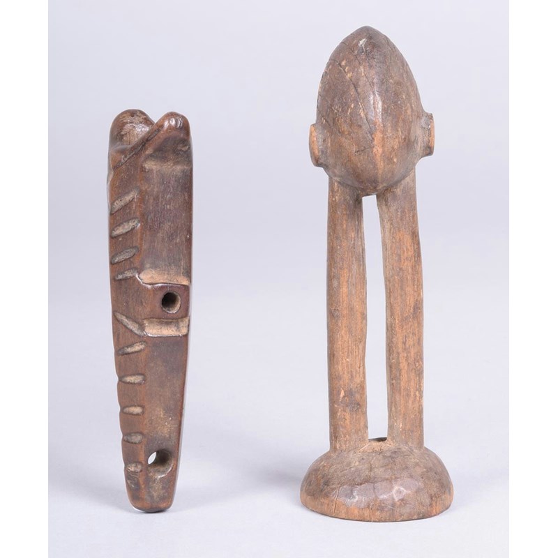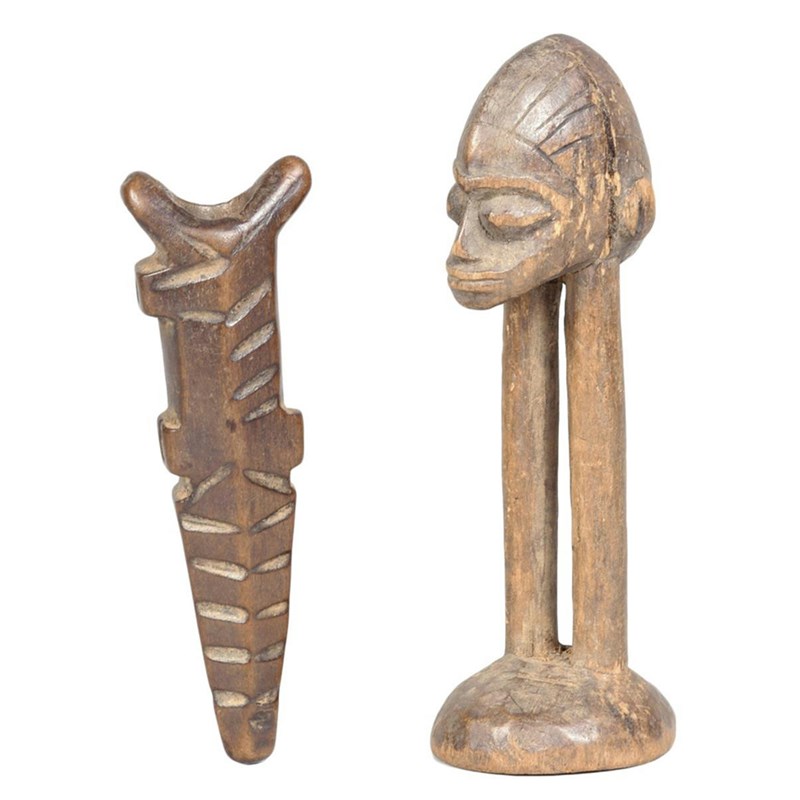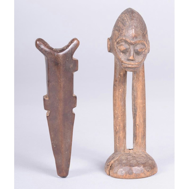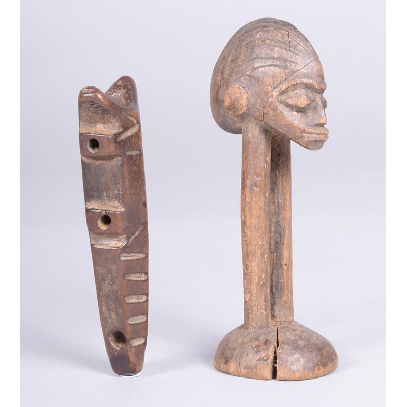 A Lobi anthropomorphic figure, Burkina Faso, of a medial ridge head with incised coiffure supported by a pair of legs on a domed base, 12cm high and a Lobi miniature whistle flute, with incised line decoration, 10cm high. (2)