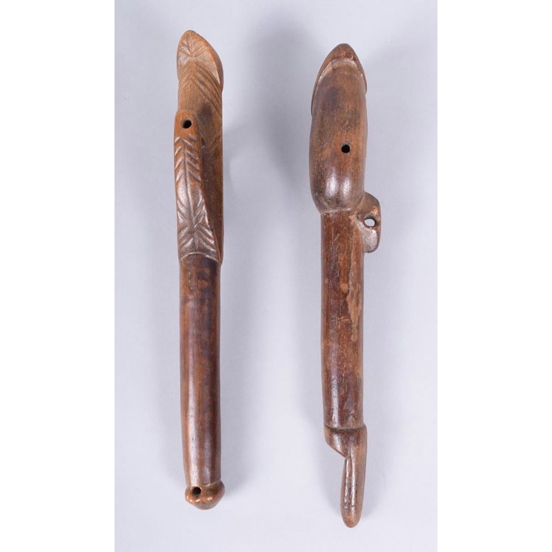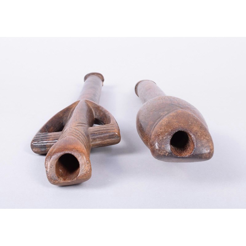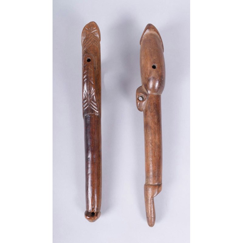 A Mossi anthropomorphic whistle/flute, Burkina Faso, with a central pierced shaft and open arms, pierced and with incised line decoration, 29cm high and a Lobi whistle/flute, with a flattened ovoid bowl, pierced and a shaft with tapering tip, traces of incised line decoration, 29.5cm high. (2)