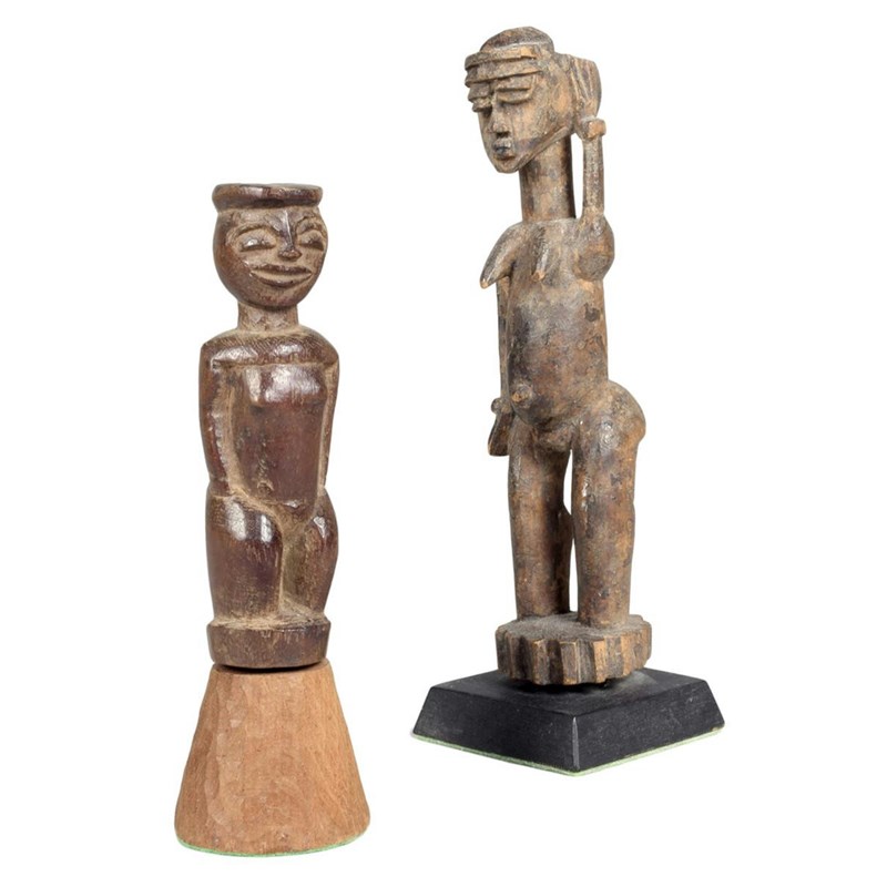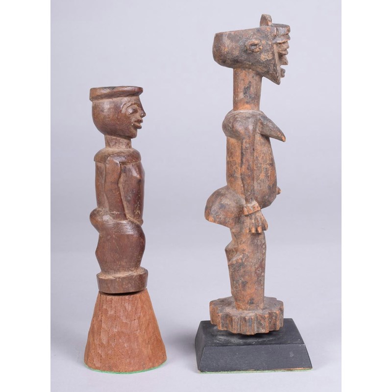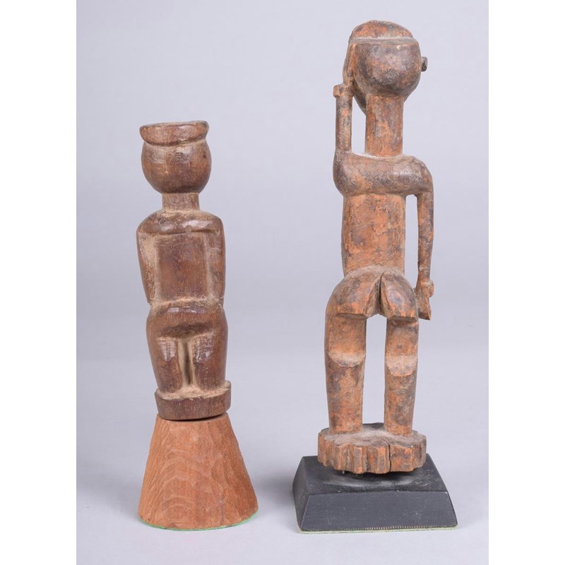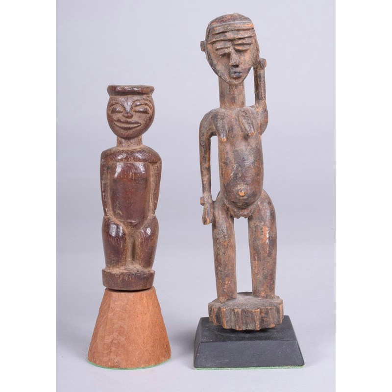A Lobi standing female figure, Burkina Faso, with a horizontal cresting and her left arm raised to her head, wearing bangles, on a toothed circular base, 19cm high, on a stand, a Lobi standing figure, with a flattened coiffure, 12cm high, on a stand. (2)