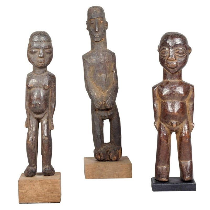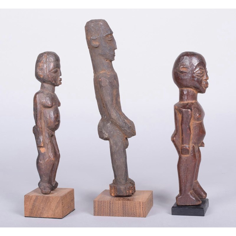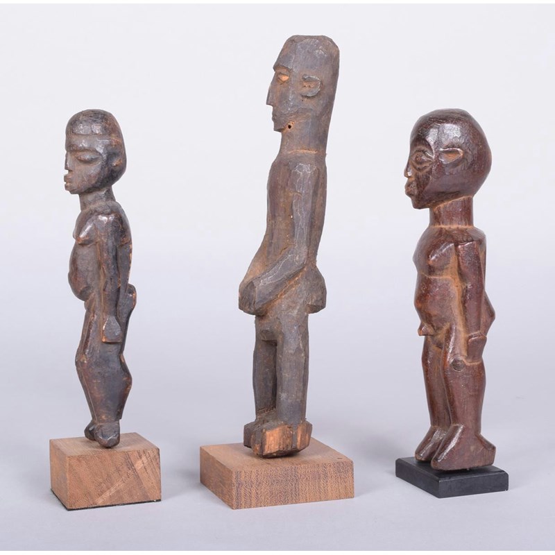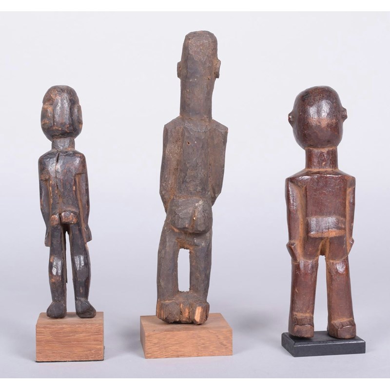 A Lobi standing male figure, Burkina Faso, with arms to the side, 20.5cm high with a stand and two Lobi standing figures, 24cm and 19cm high, on stands. (3)