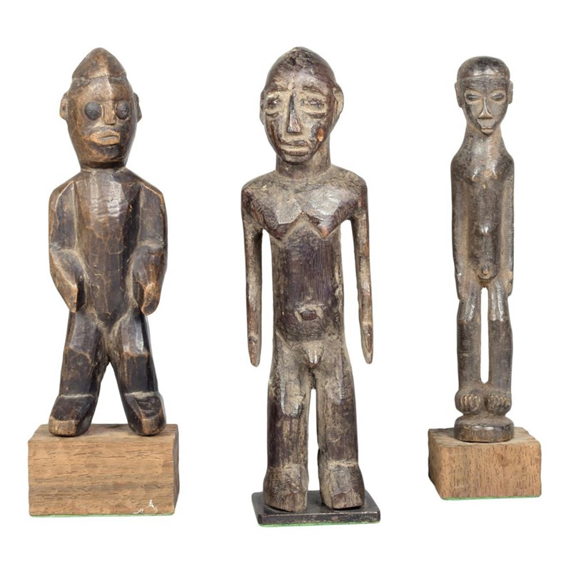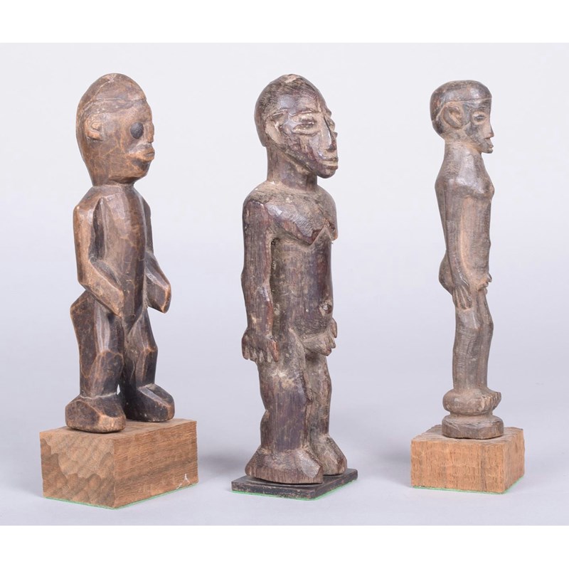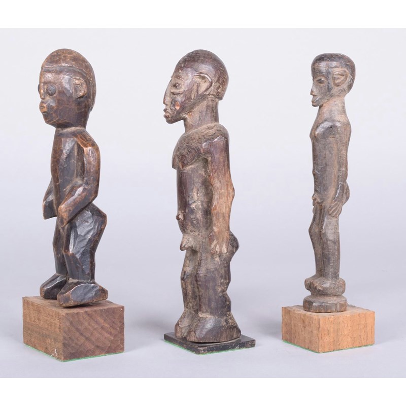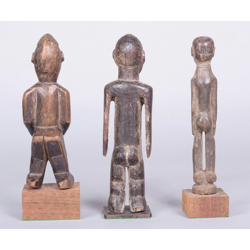 A Lobi standing male figure, Burkina Faso, with open arms, 22cm high, on a stand, a Lobi standing figure, with wide crested coiffure and inset metal eyes, 19.5cm high, on a stand and a Lobi standing male figure, 19.5cm high, on a stand. (3)