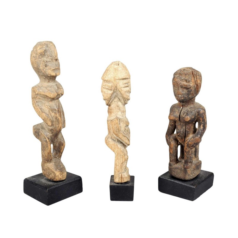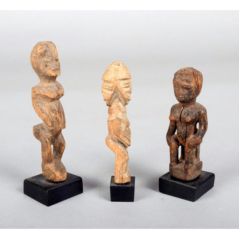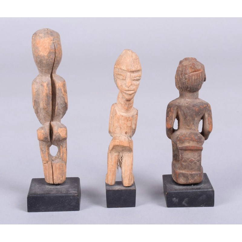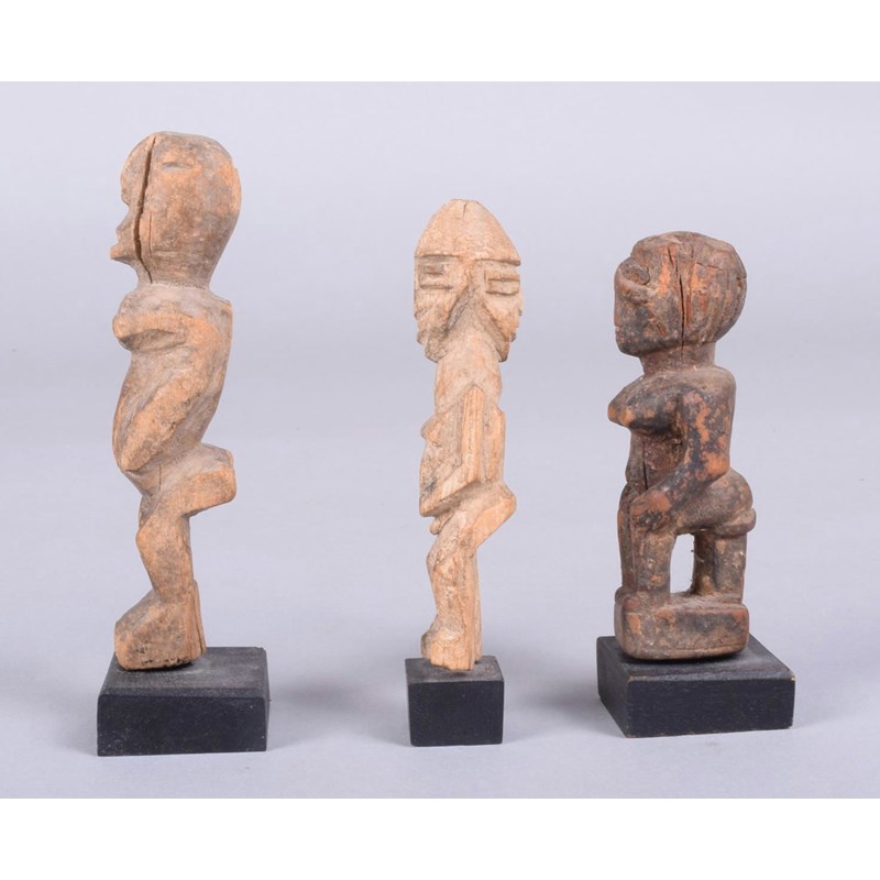 A Lobi miniature standing Janus figure, Burkina Faso, with rectangular eyes, 8cm high, on a stand, a Lobi standing figure, 9.5cm high, on a stand and a seated female figure, with hands resting on her knees and a lozenges incised to the back of the stool, 7.5cm high, on a stand. (3)