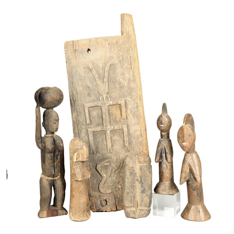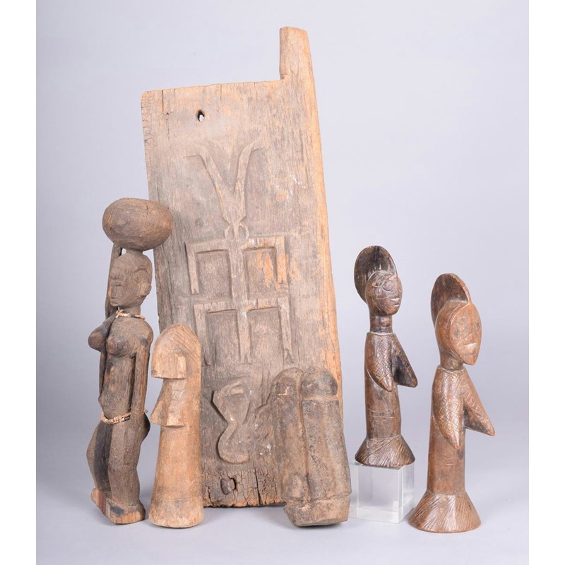 A Dogon grain door, carved a stylised figure and a serpent, 46.5 x 17cm, three Mossi dolls, the highest 24cm, a Dogon female figure and an East African double figure. (6)