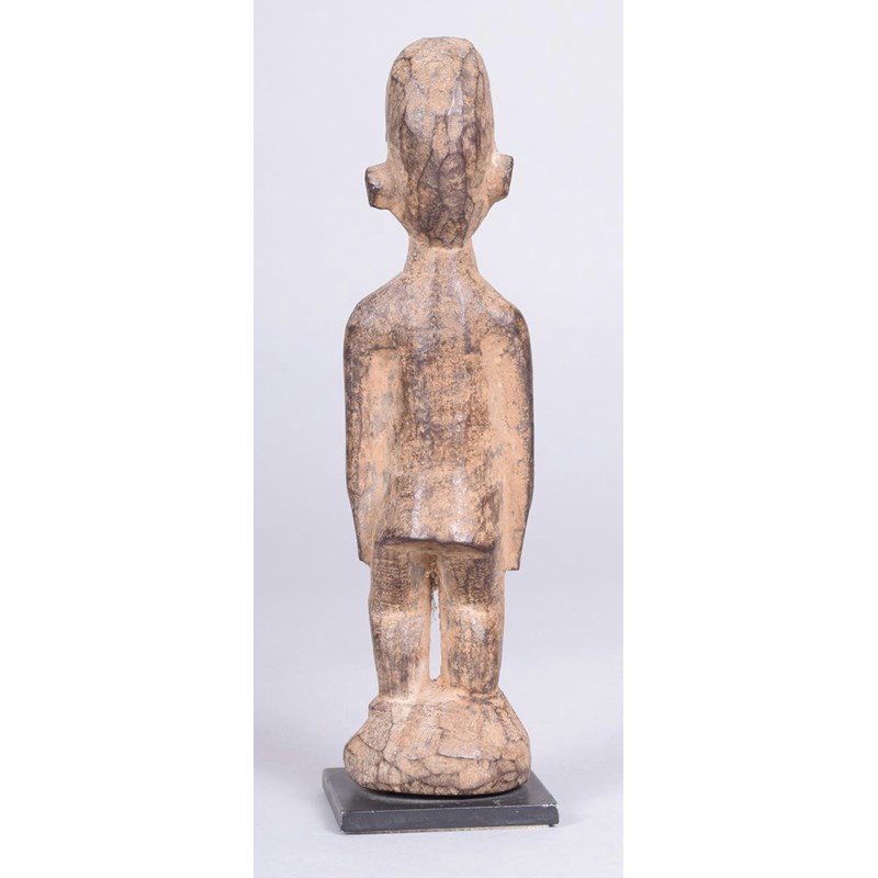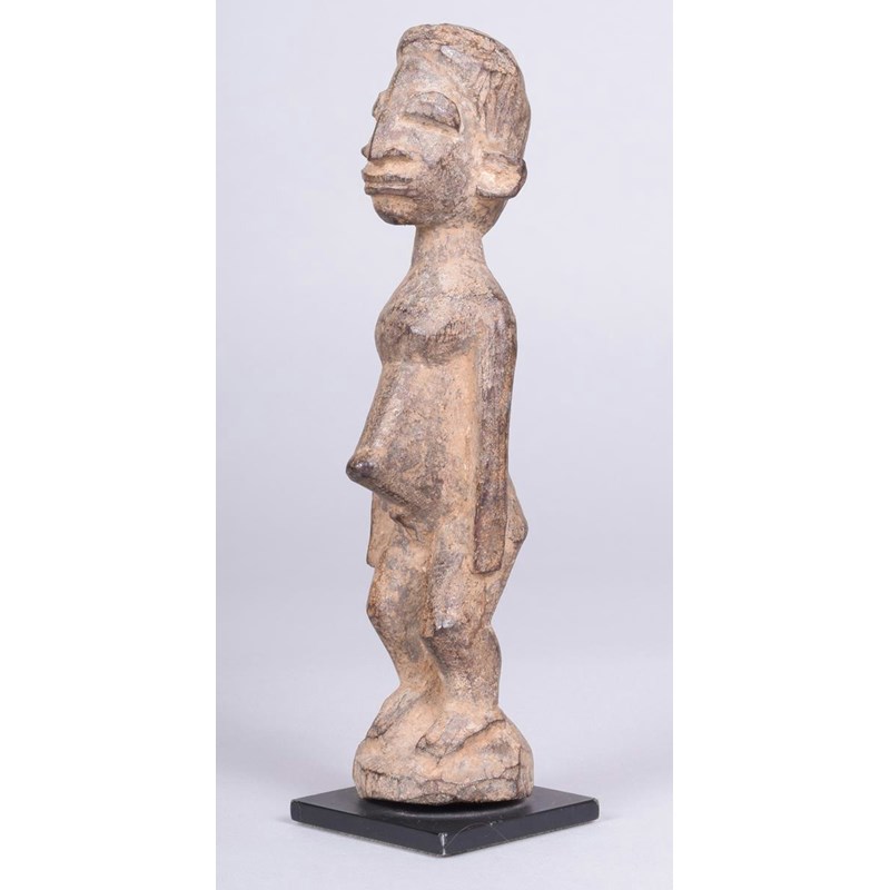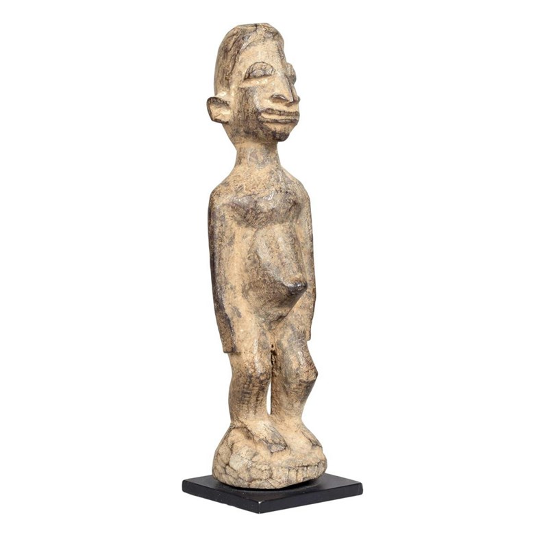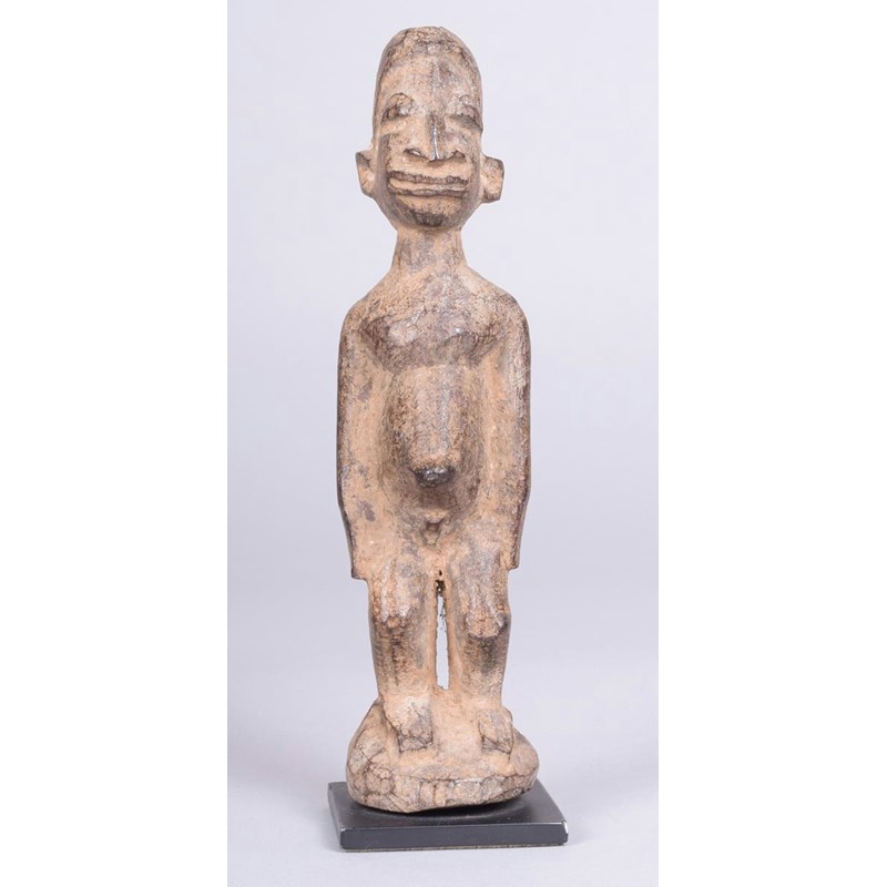 A Lobi standing child figure, Burkina Faso, with crescent eyes, large smile and pronounced stomach, 19cm high on a stand.