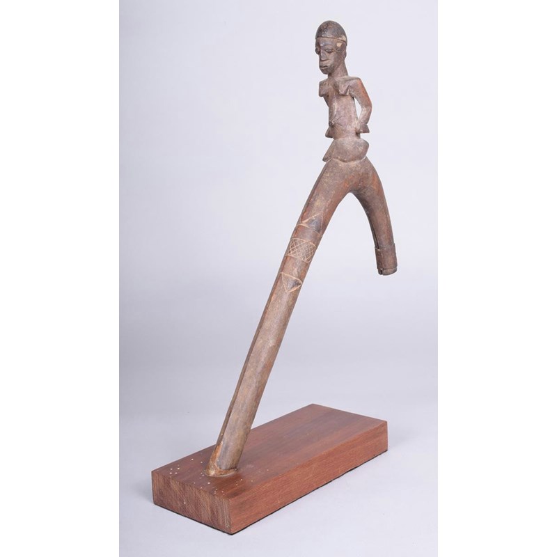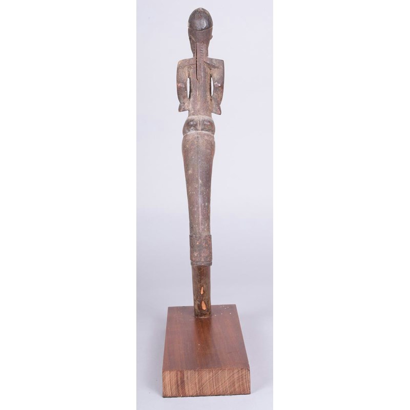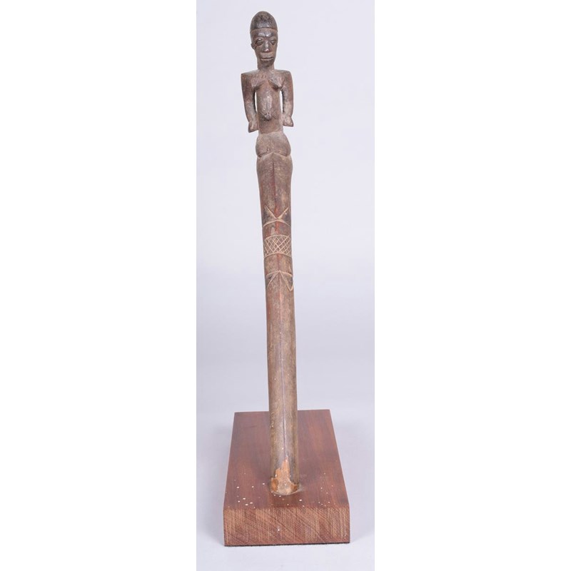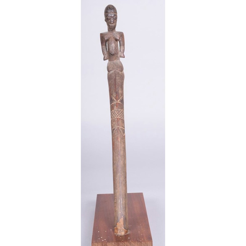 A Lobi staff, Burkina Faso, the ridged shaft with incised and stained decoration with a figural surmount having a cap coiffure, the tip with a metal collar, reduced, 40.5cm high, mounted.