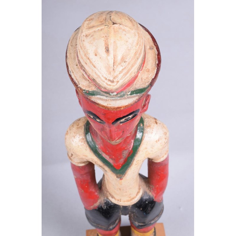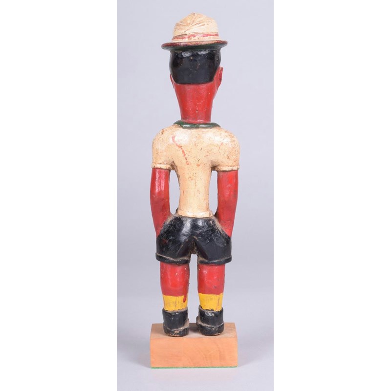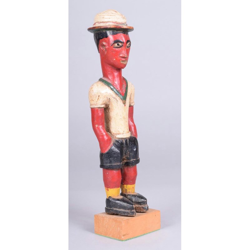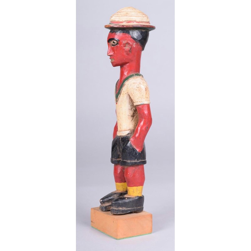 A Colon standing male figure, Ivory Coast, wearing a hat, short sleeved shirt and shorts, with his hands in his pockets, painted red, white, black, green and yellow, 25cm high, on a stand.