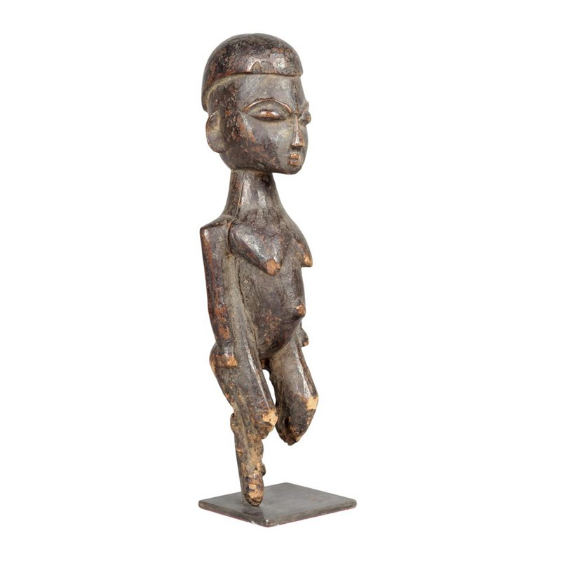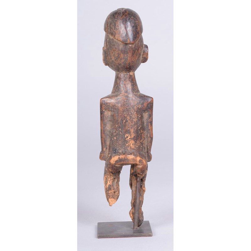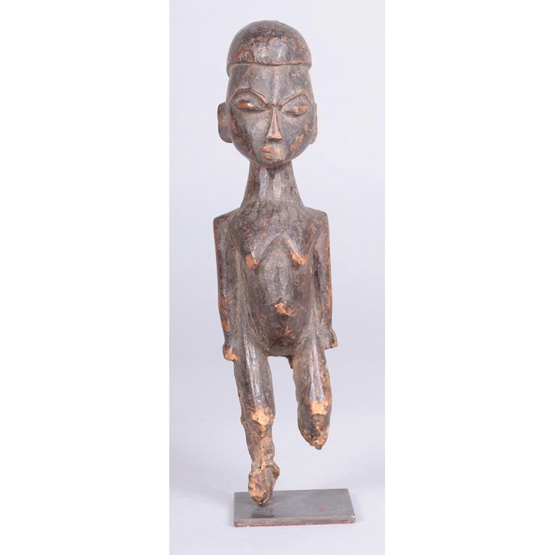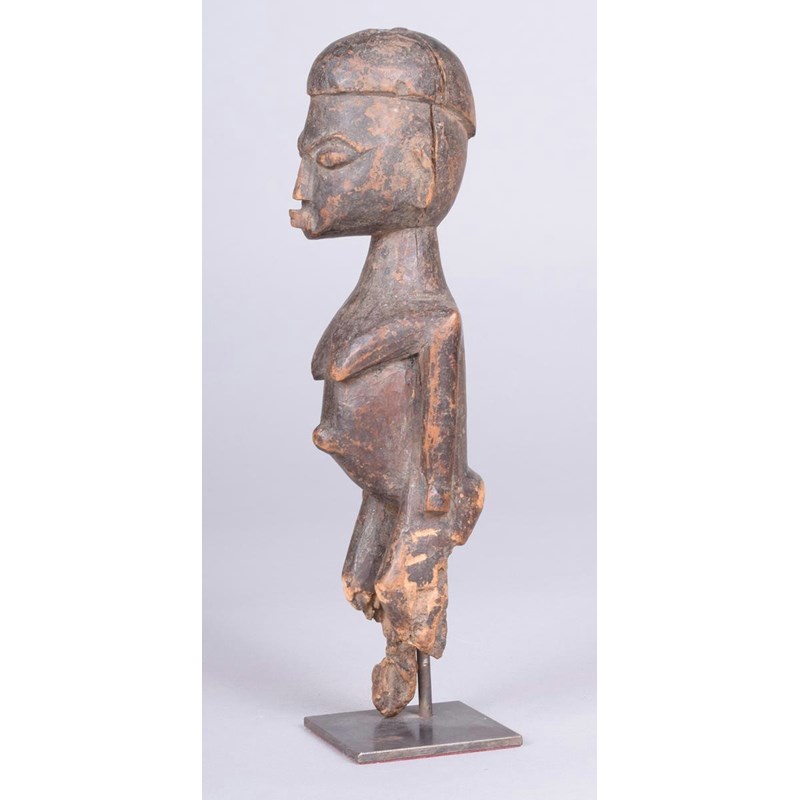 A Lobi standing pregnant female figure, Burkina Faso, with pointed coiffure, the legs with termite damage, 20cm high, on a stand.