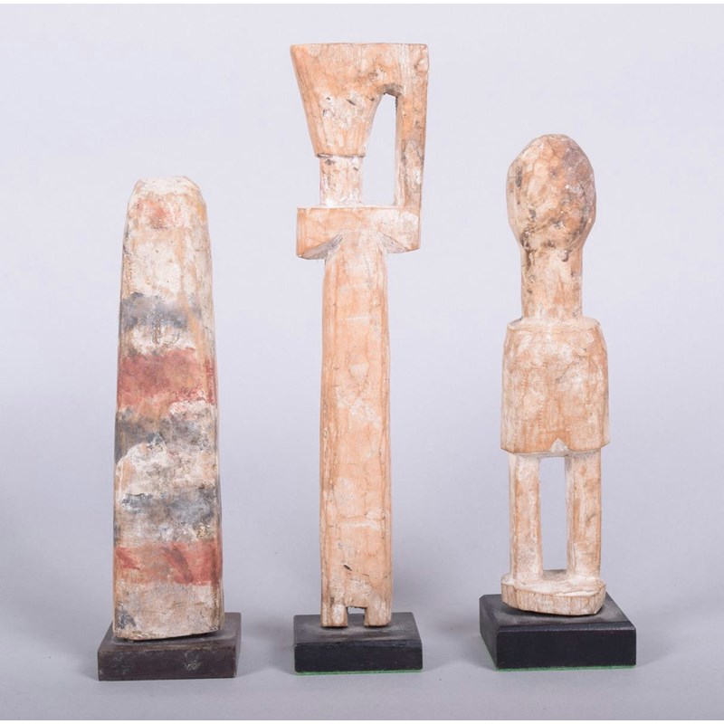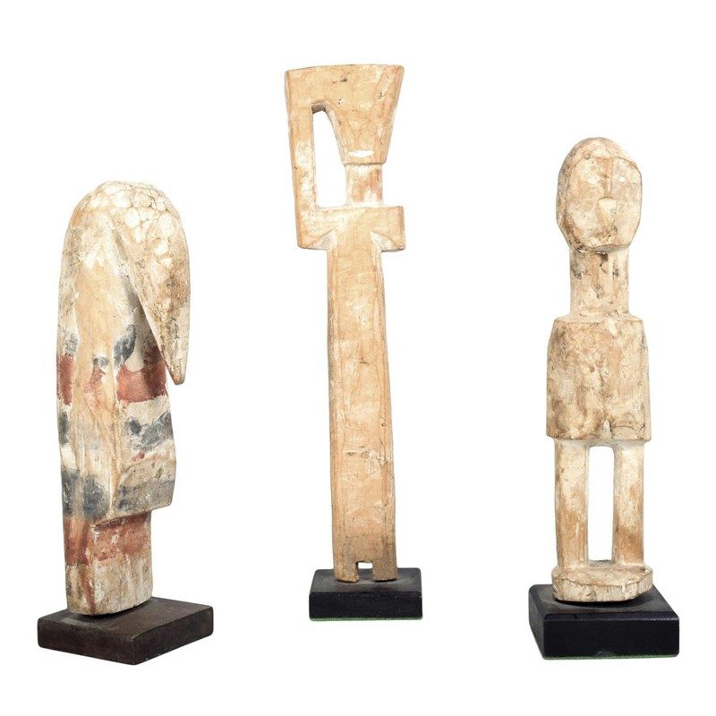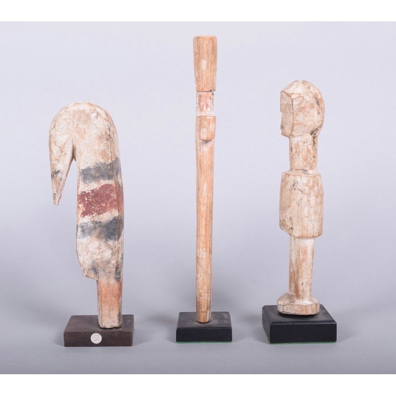 An Adan standing figure, Ghana, of abstract form with right arm raised to the head, traces of white pigment, 21cm high, on a stand, an Adan armless standing figure, 17.5cm high, on a stand, an Adan bird, with a white pigment ground with black and red stripes, 16.5cm high, on a stand. (3)