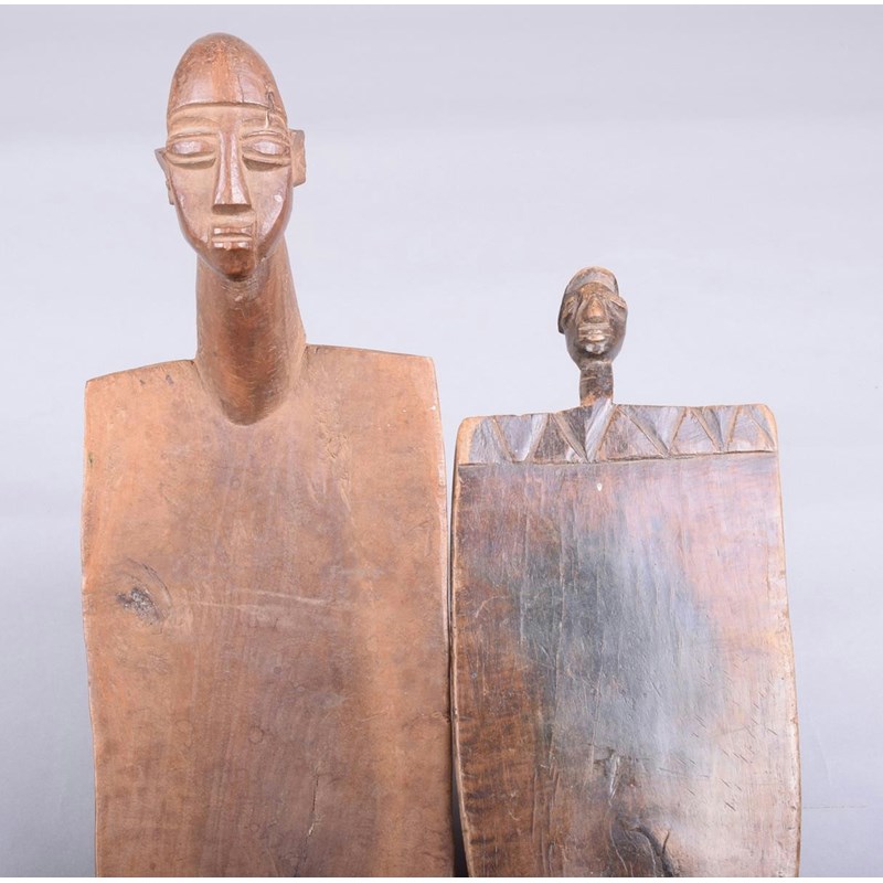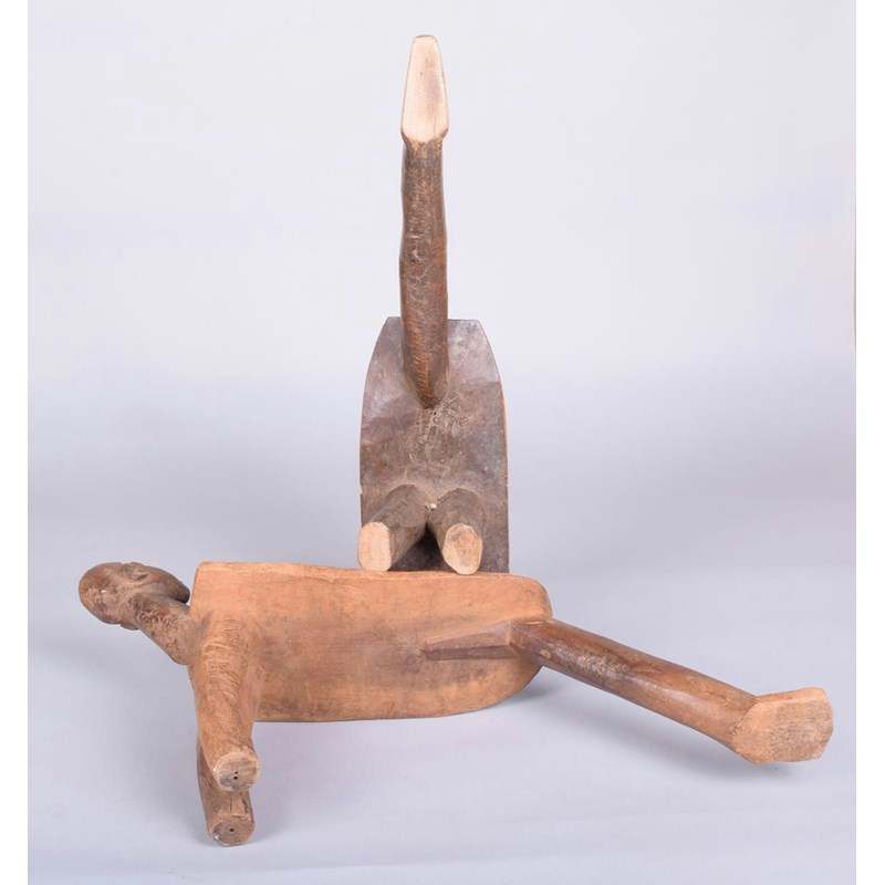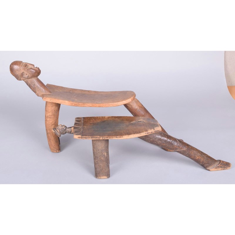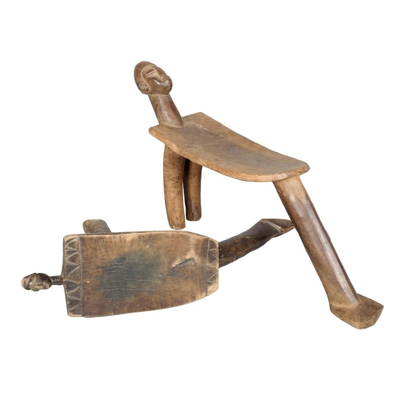 A Lobi stool, Burkina Faso, the seat with chevron ends and a carved head head wearing a cap, 14.5cm high, a Lobi stool, with a dished seat and a carved head, 28.5cm high. (2)