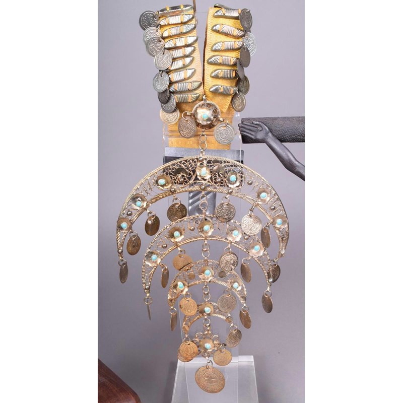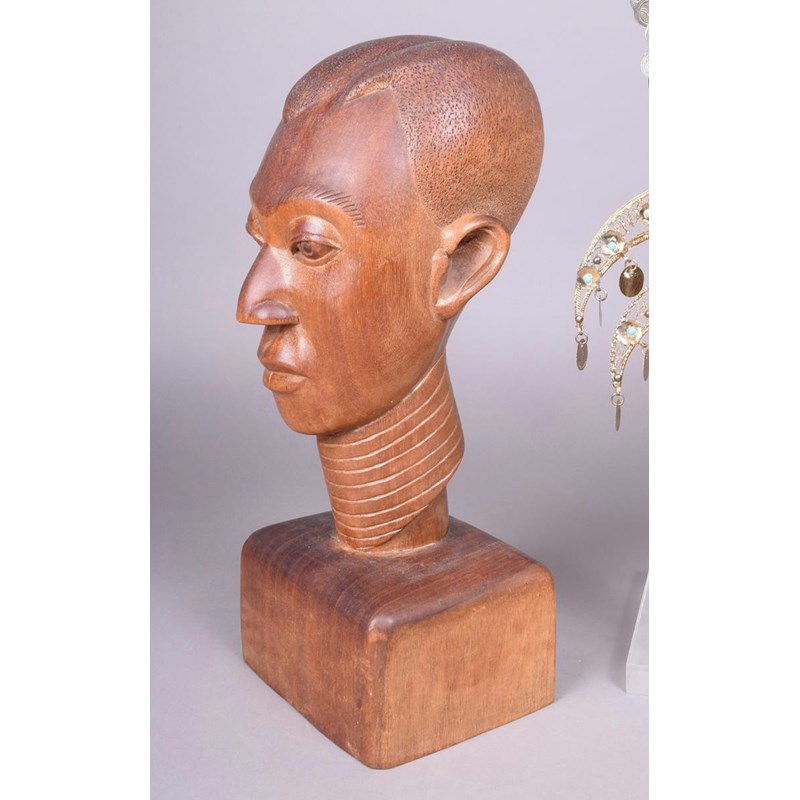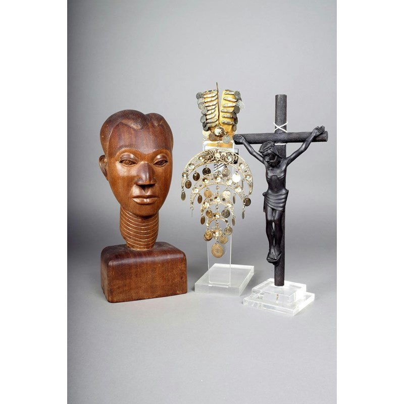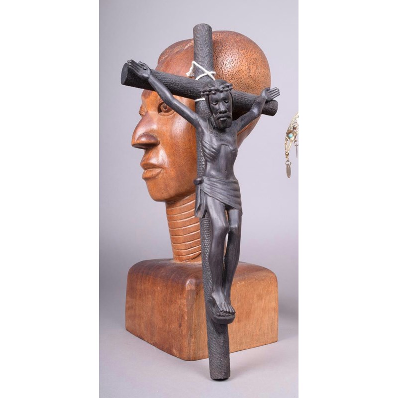An African ebony Corpus Christi, the crucifix 37cm high, a gilt metal necklace, 42cm high and a carved wood head, 38.5cm high. (3)