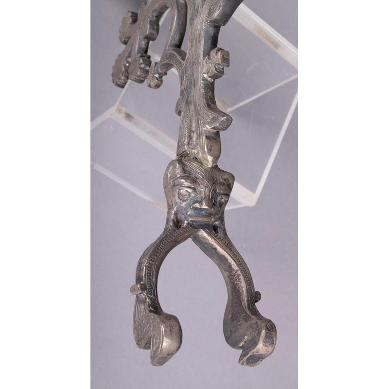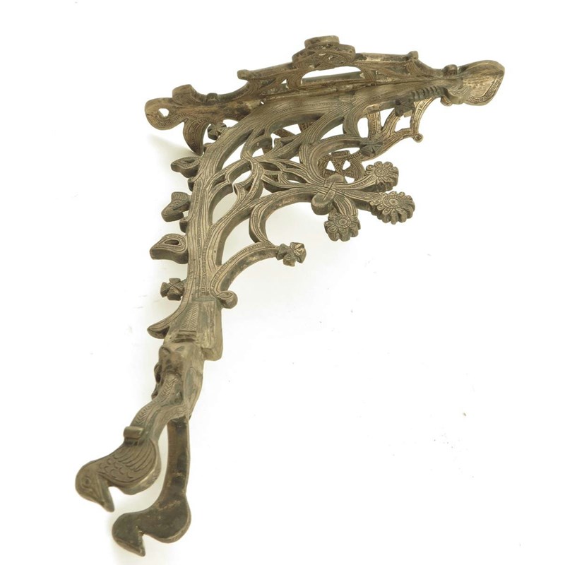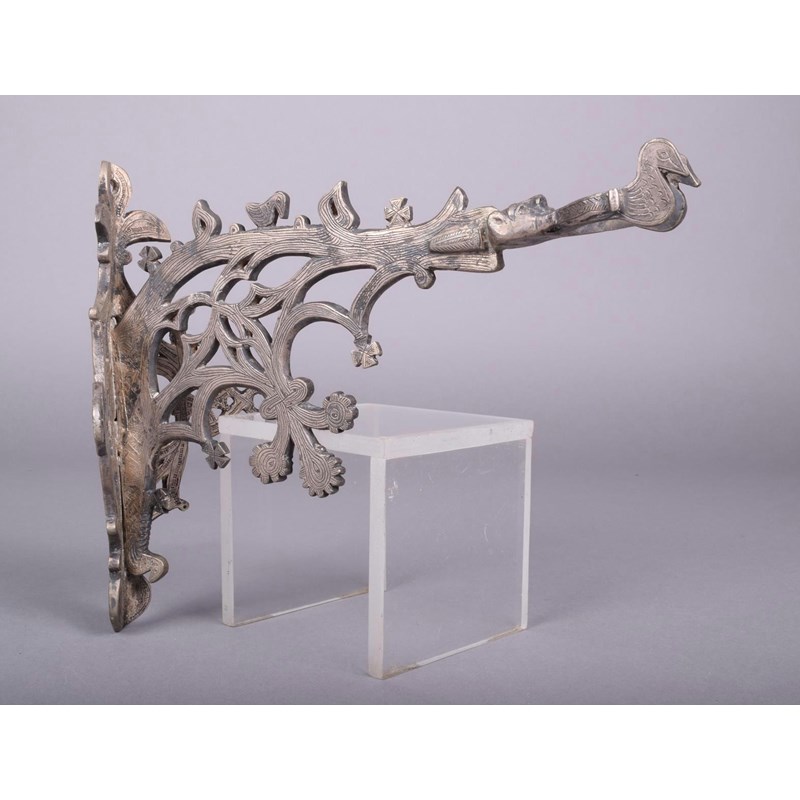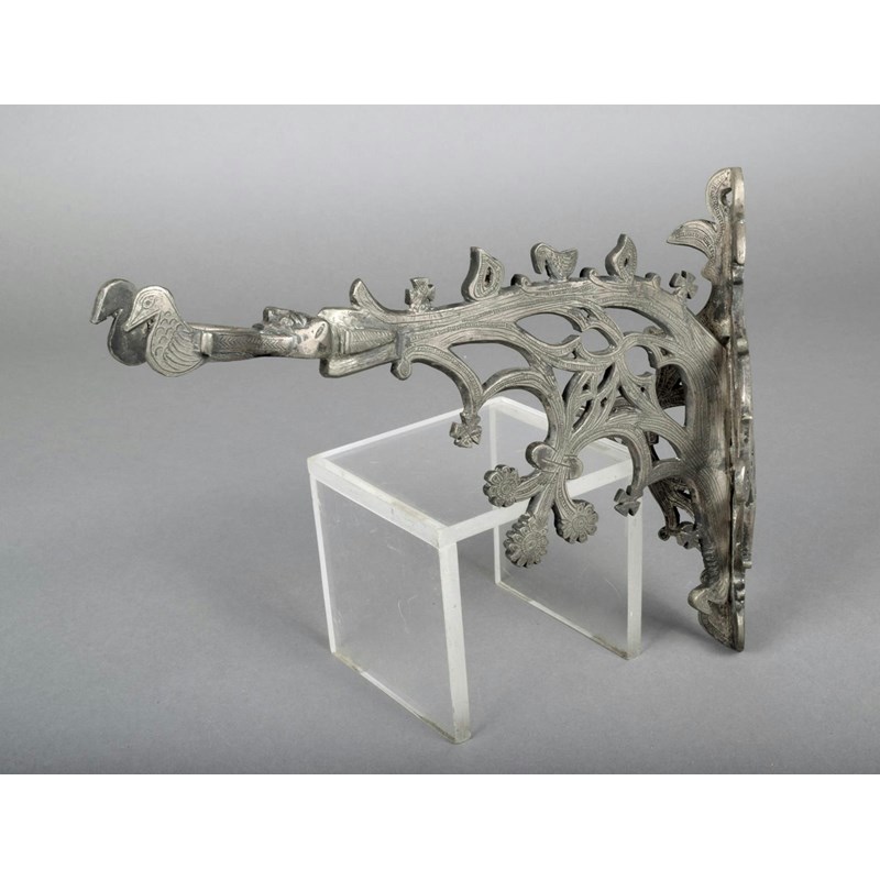 An Ethiopian silver coloured metal bracket for an incense burner, pierced and engraved with birds, flowerheads, crosses and an animal head terminal, 22cm high, 26.5cm long.