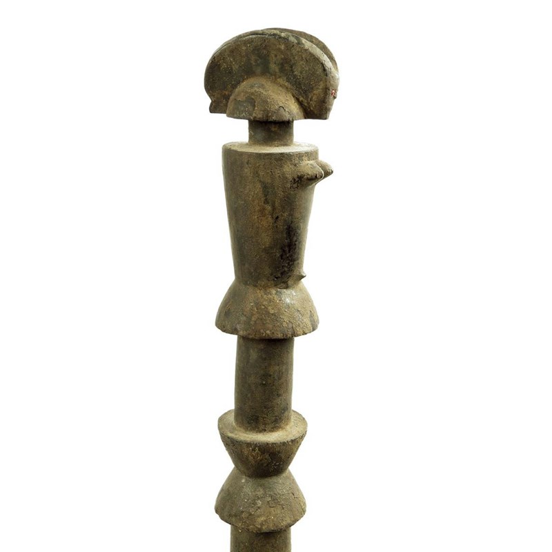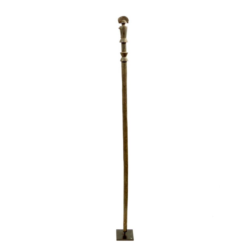 A Tanzanian staff, with stylised female figure terminal, inset bead eyes, with black encrusted patination, 107.5cm high and later stand.