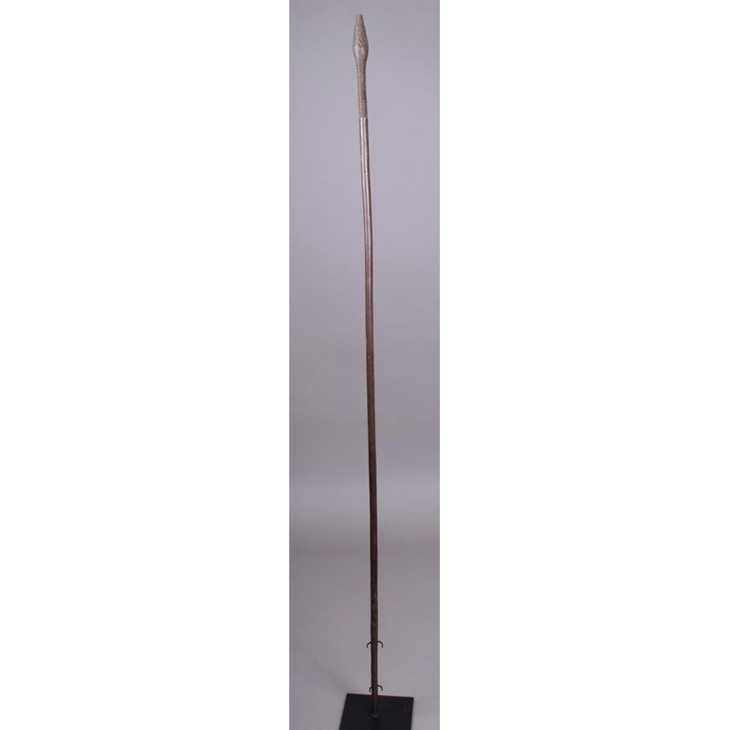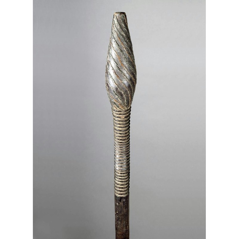 A South African staff, with an ovoid finial applied spiral wirework and a stepped notch collar, with a brass bound tip, 141cm long.