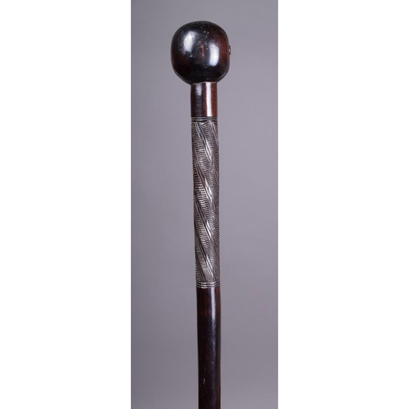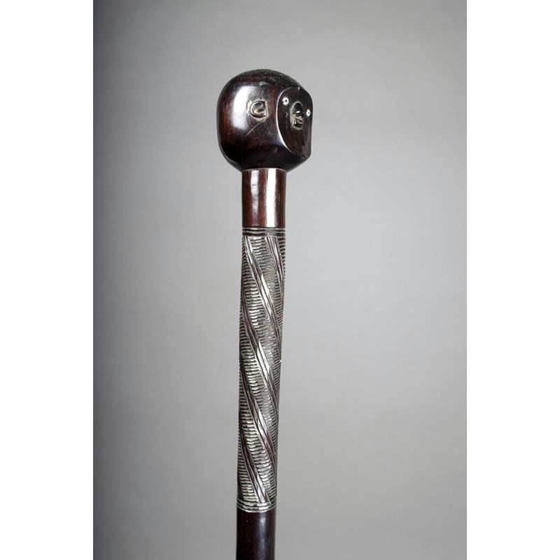 A Nyamwezi carved hardwood staff, Tanzania, with a head handle with concave face and inset bead eyes, the shaft with a spiral band of ribbing, the base with a soft metal tip, 103cm high.