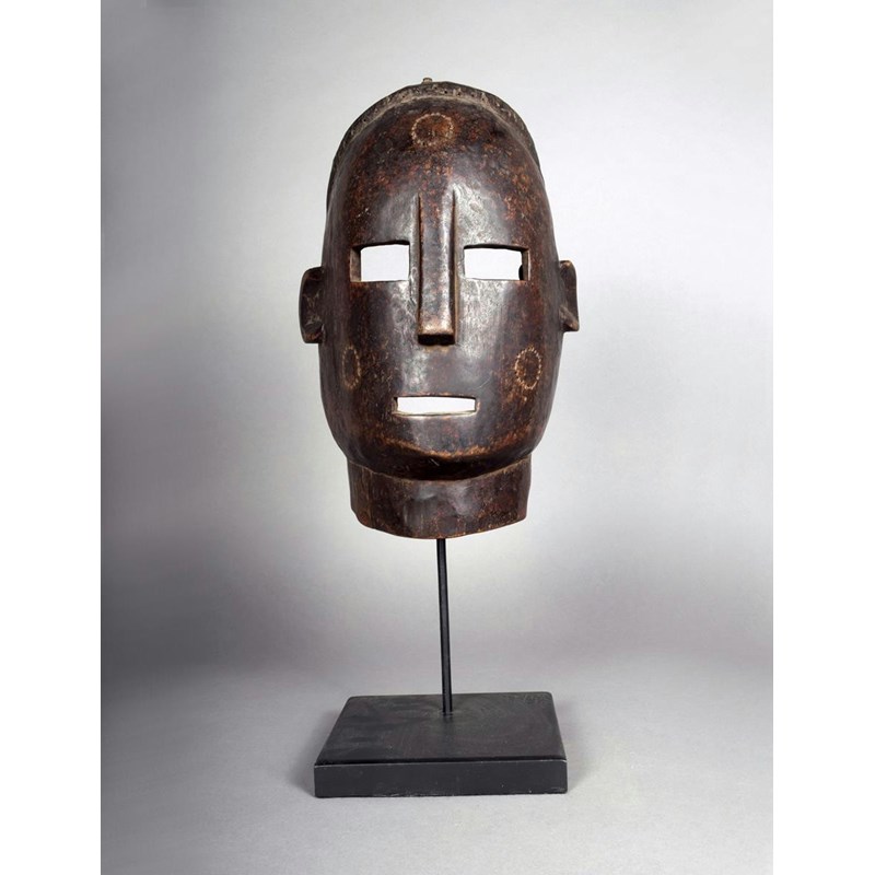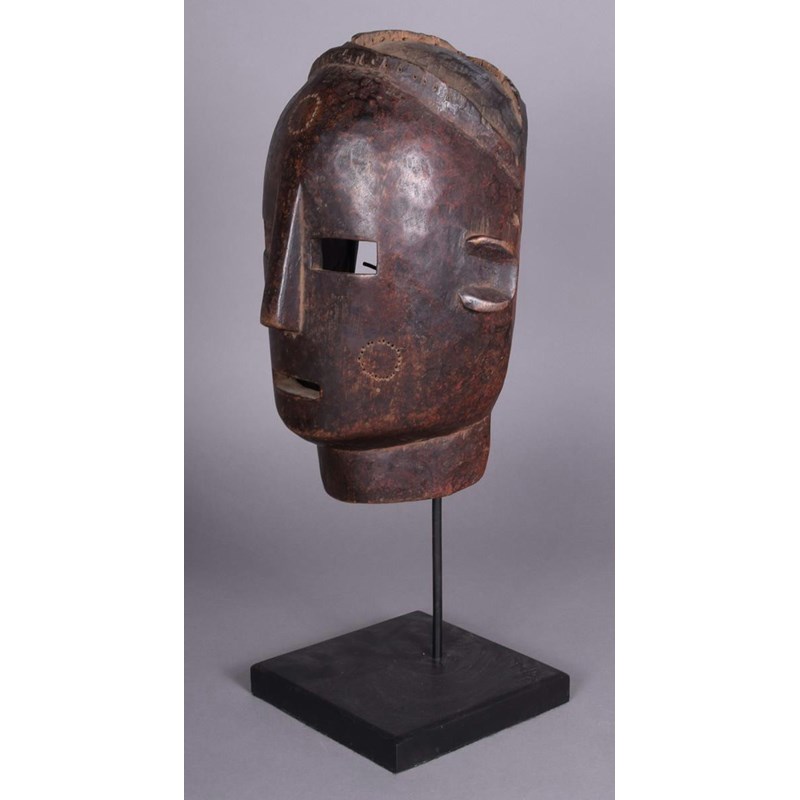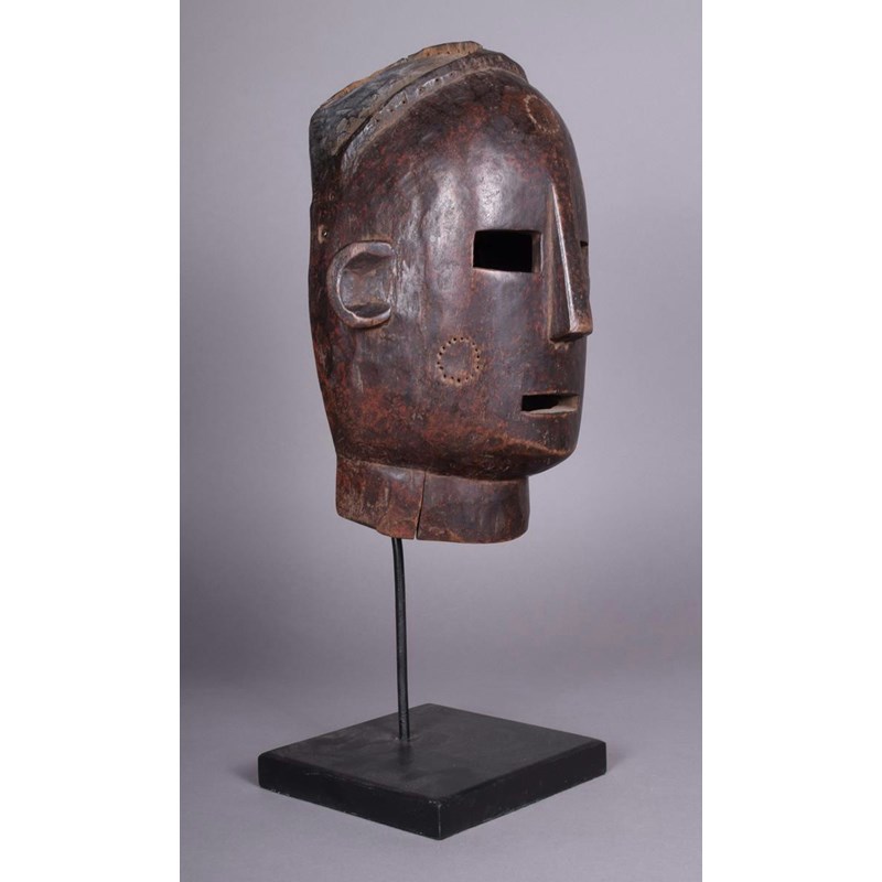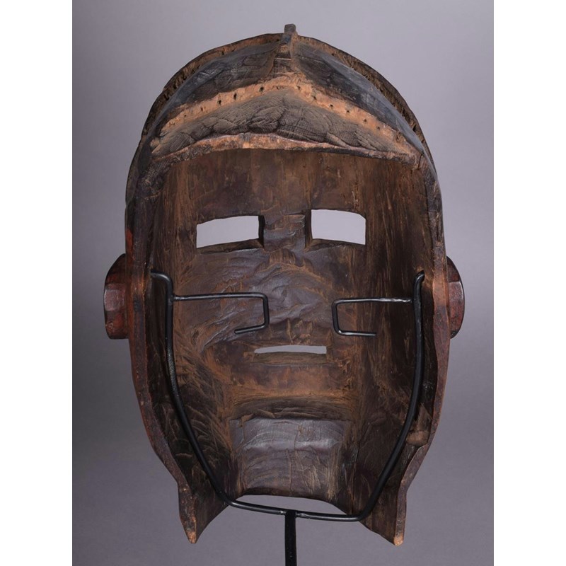 A Nyamwezi mask, Tanzania, with pierced ridged coiffure, rectangular eyes and mouth, with pierced circles, red/black patina, 34cm high, on a stand.