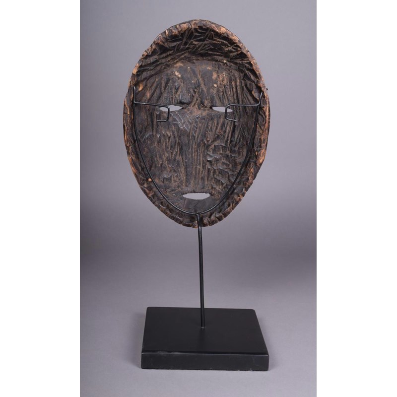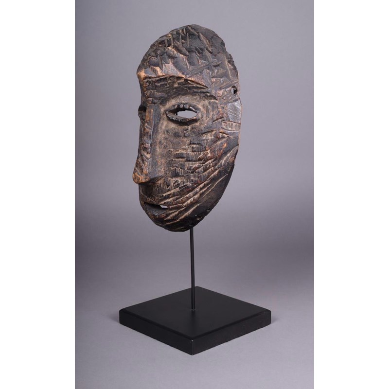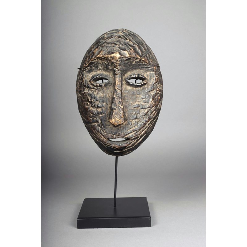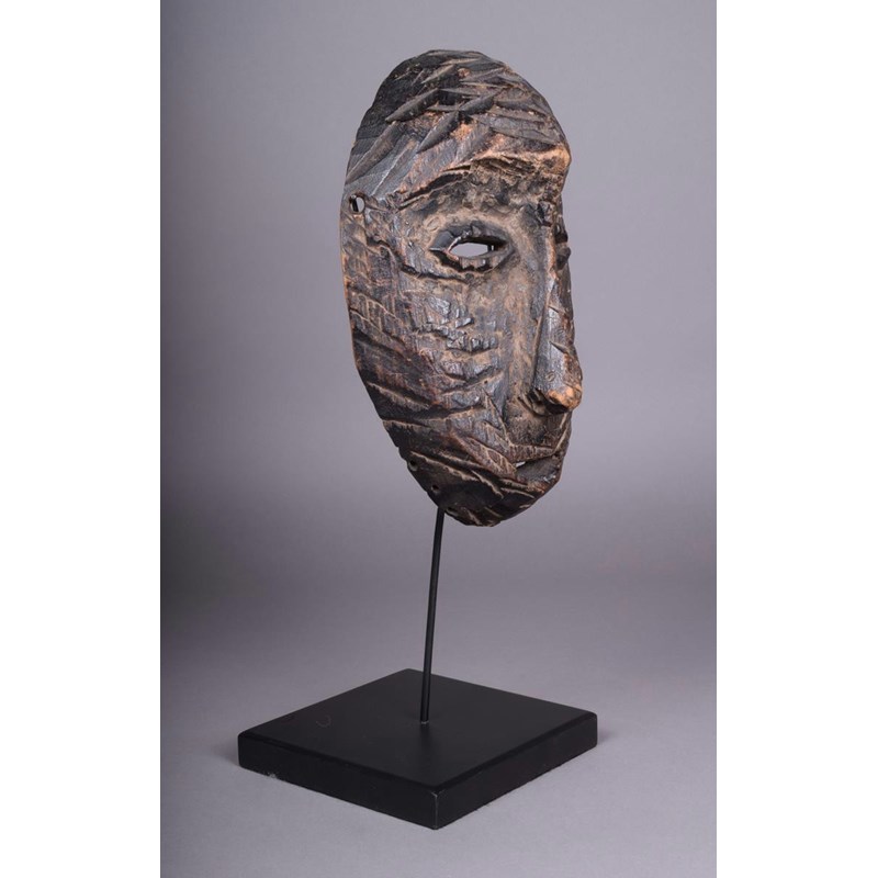 A Lega hunting mask, D R Congo, wood with a textured finish and pierced holes around the base, 32cm high, on a stand.