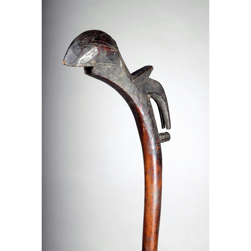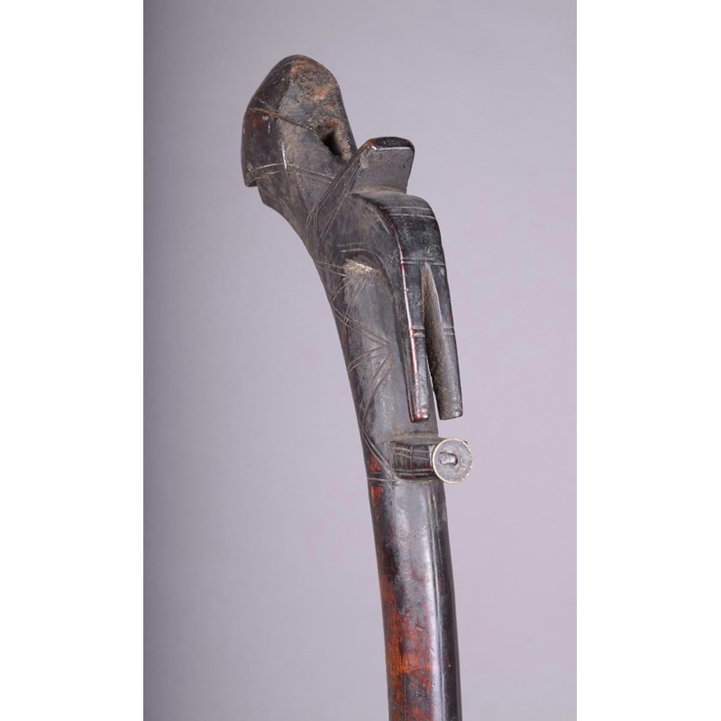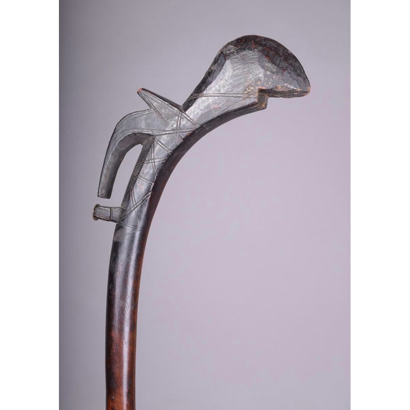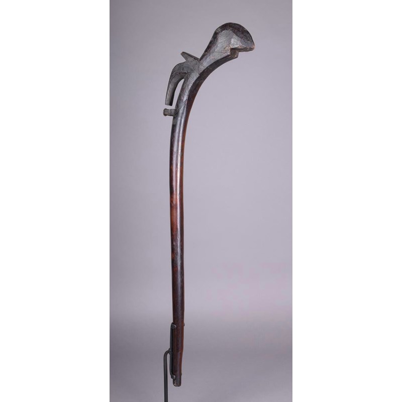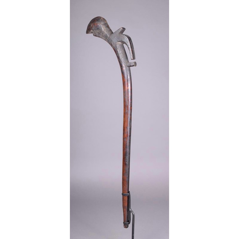 A Makonde staff, Mozambique, the curved head with incised decoration and with an applied metal disc and carved horns, previously with a blade, 77.5cm high, with a stand.