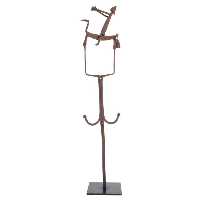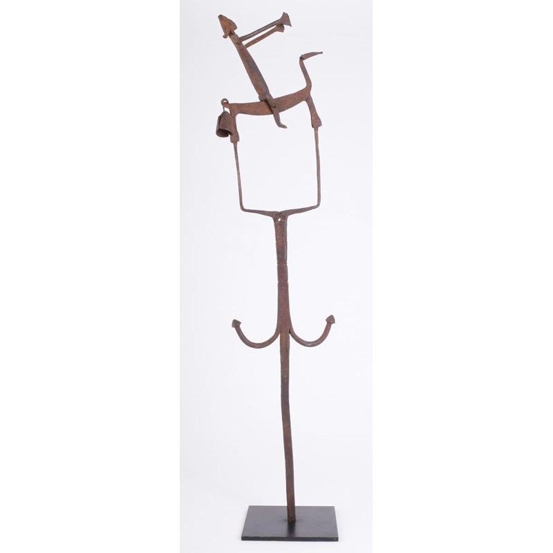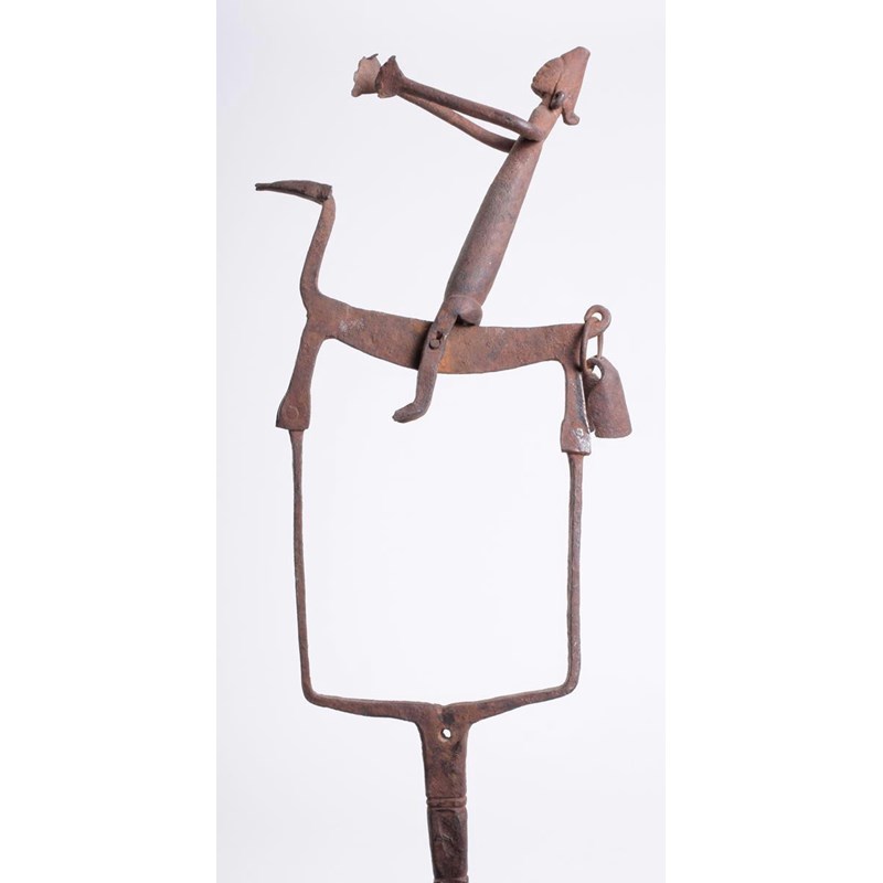 A Bambara iron staff, Mali, with an equestrian pivoting figure and bell, 82cm high, on a later stand. (2)