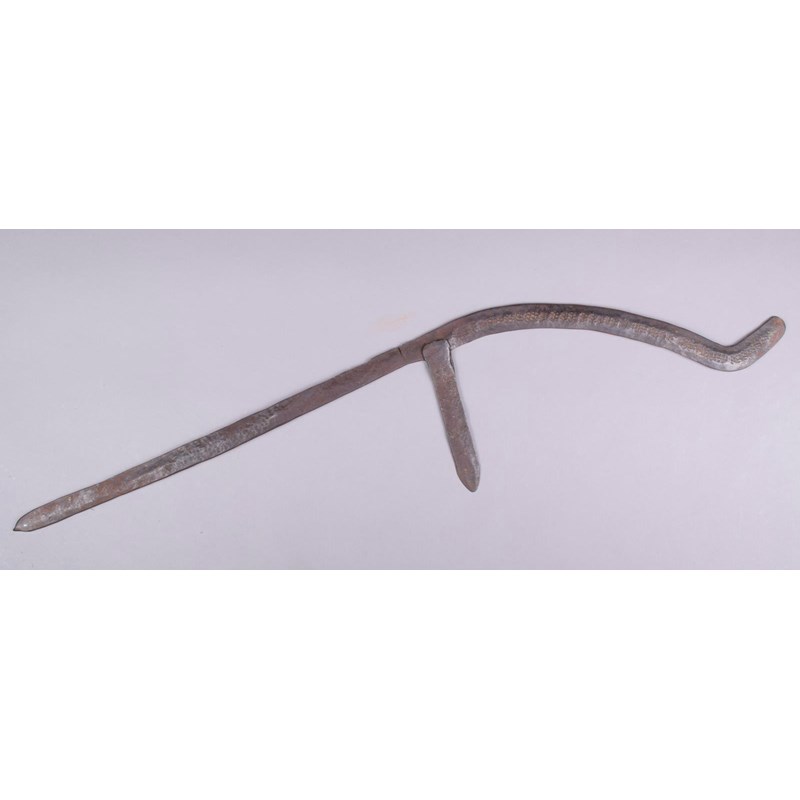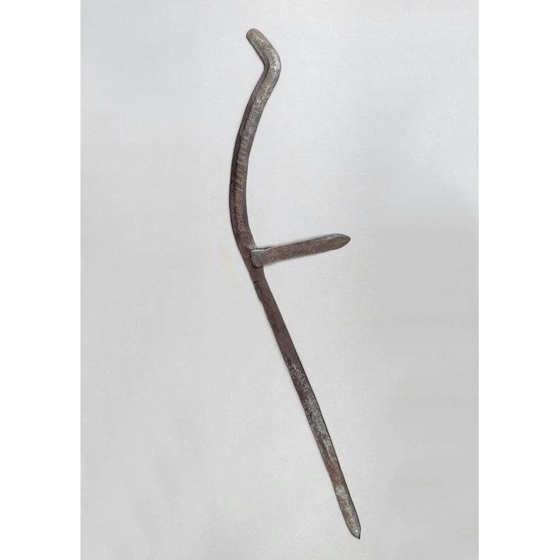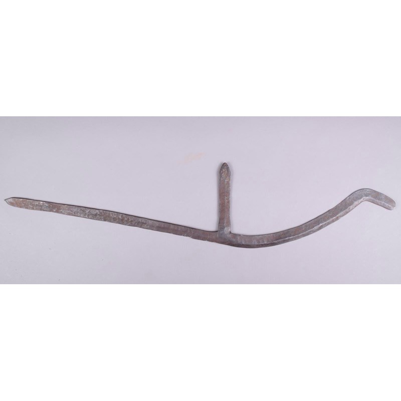 An African iron throwing knife, one part with stamped pattern, 77cm long.