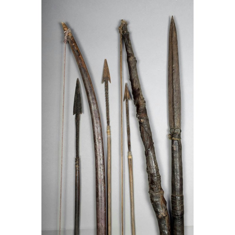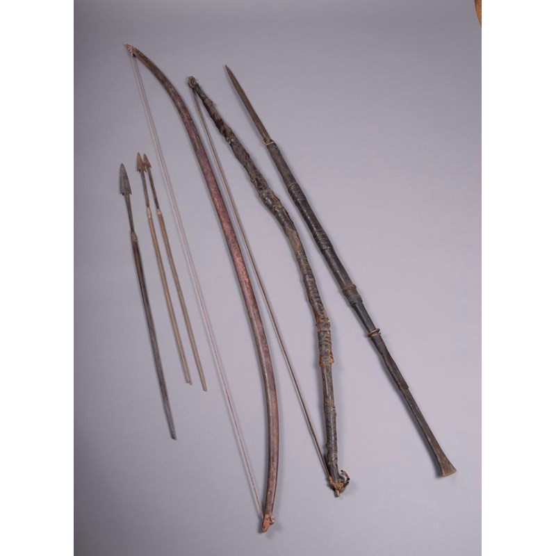 An African spear, with iron, leather and copper, 125.5cm long, two wooden bows, one hide covered, and three arrows. (6)