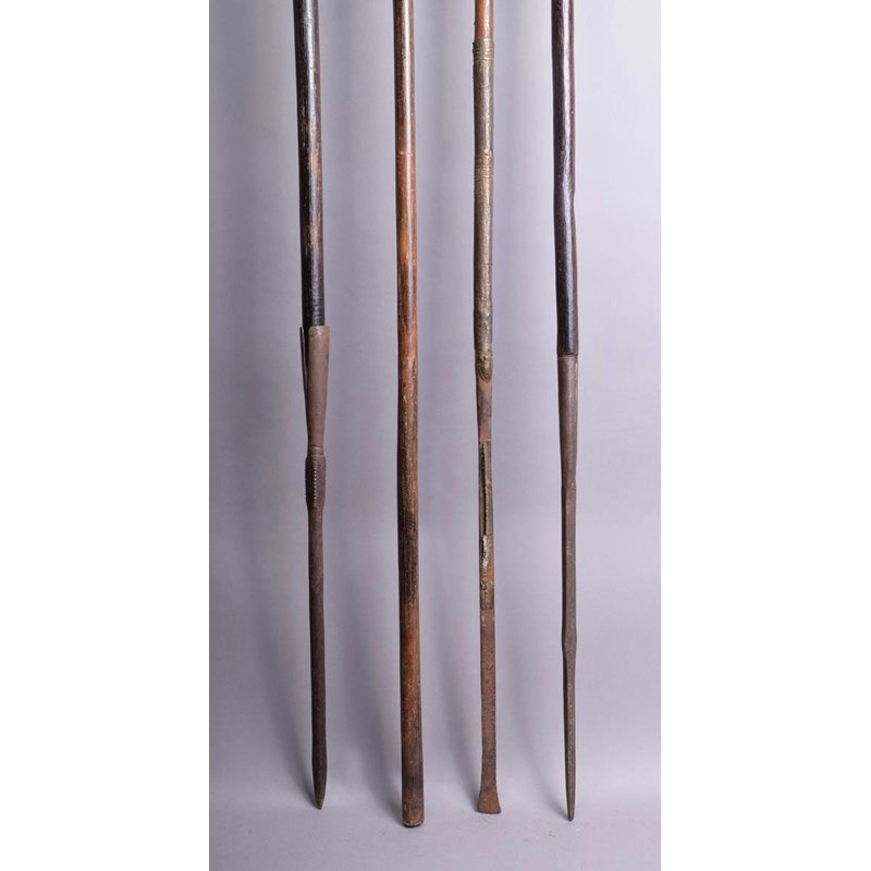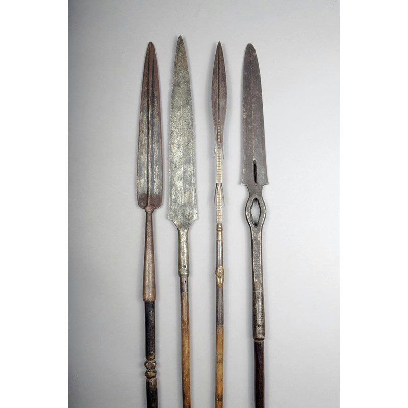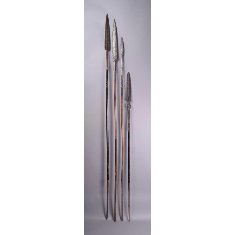 A Kuba spear, with a pierced blade and facetted socket with incised decoration, with wood shaft and long metal spike tip, 150cm long, a Tuareg spear, with fish tail blade and brass overlay, on a wood shaft with shhet metal and a flattened metal tip, 182.5cm long, a Congo spear with knopped wood shaft and pointed metal tip and another African spear. (4)