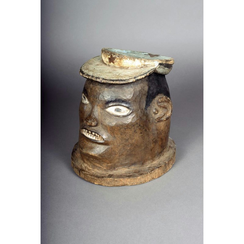 A Makonde helmet mask, Mozambique, wearing a peaked cap with applied stars, with filed teeth, 25.5cm high.