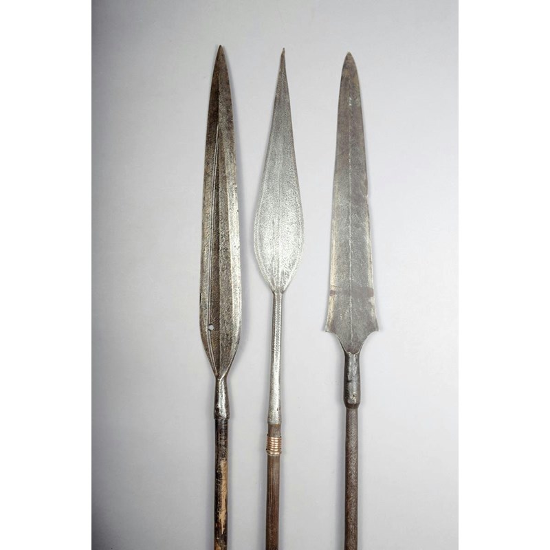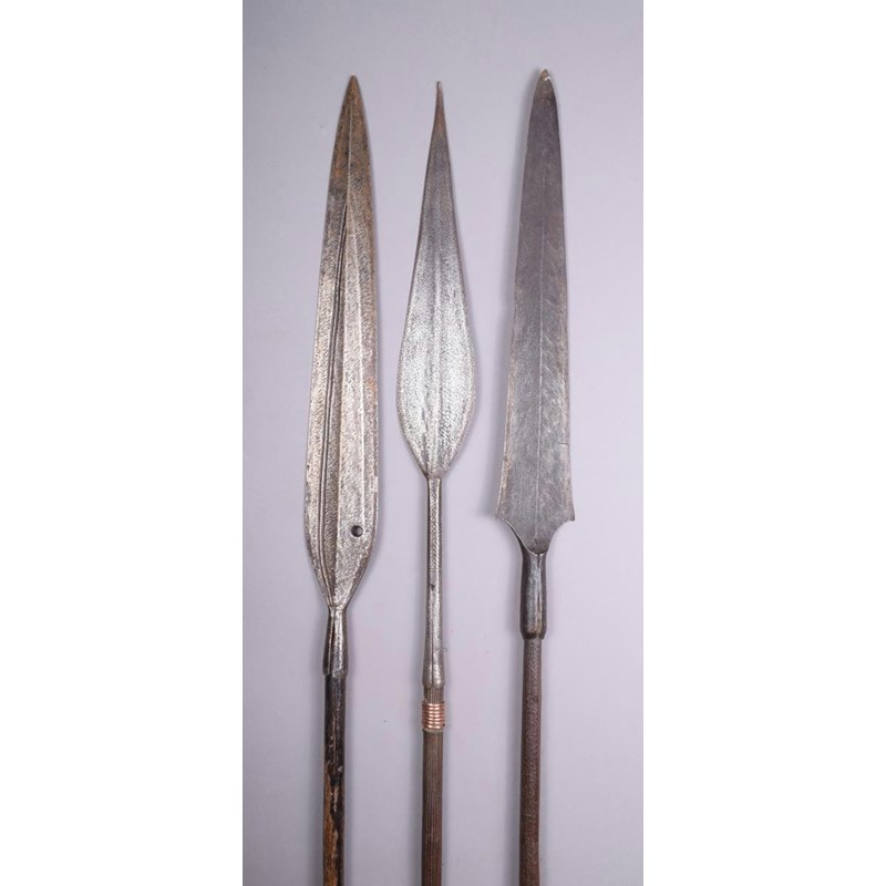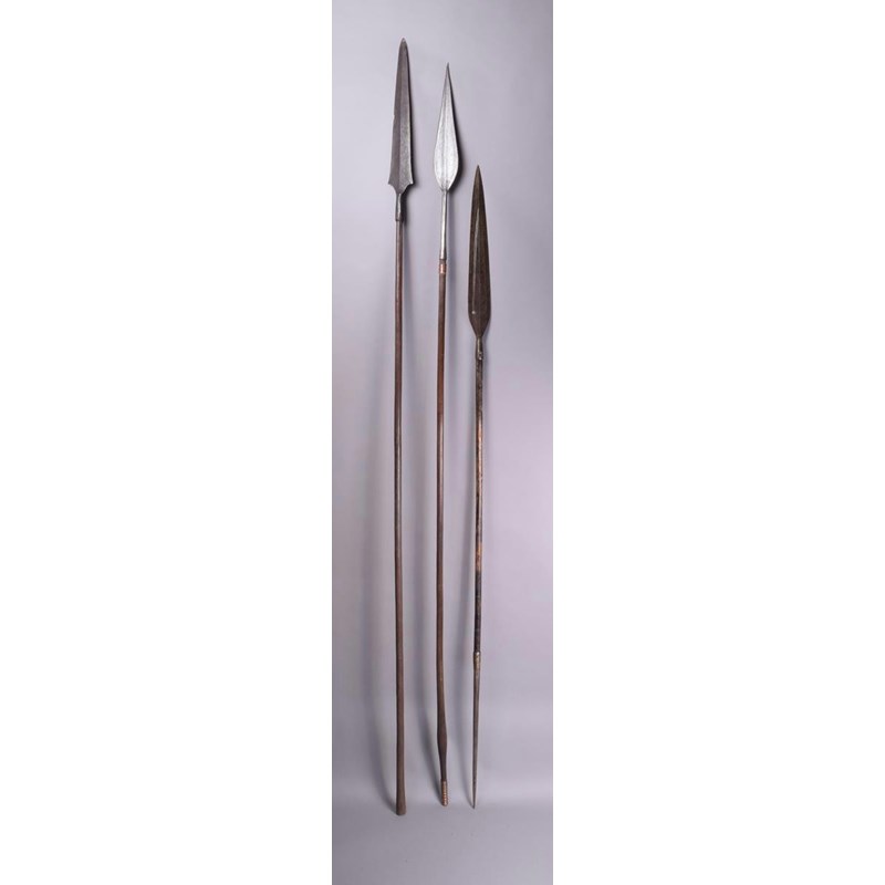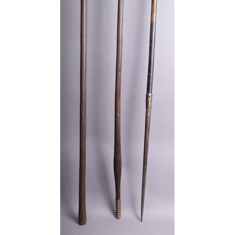 A Congo spear, with leaf shape bade and chevron incised socket on a wood shaft with fine incised lines and a swollen section towards the tip with coiled copper, 203cm long, a Congo spear with incised shaft and a Kuba spear, the tip with a pierced hole. (3)