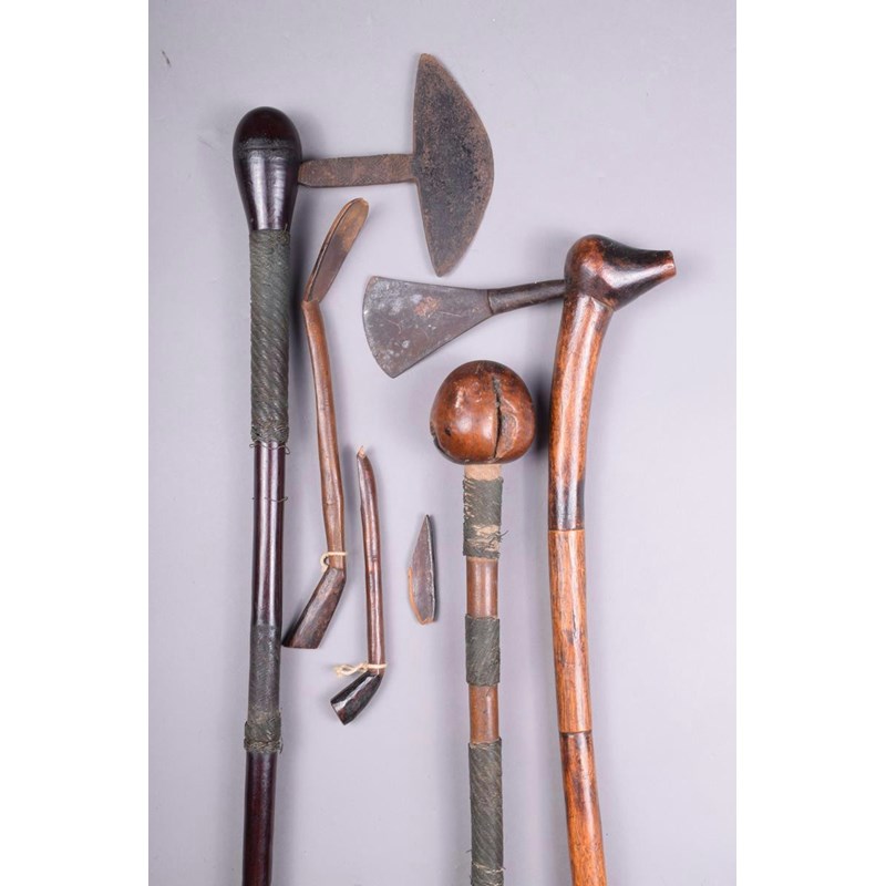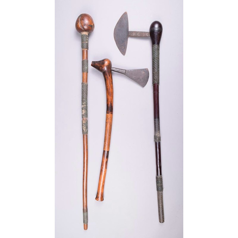 A South African knobkerrie, with wirework bands, 78cm long, a South African axe, with a part decorated iron blade, the wood shaft with wirework bands, 77.5cm long, a Shona axe, with a bulb shape head and relief banded handle, 50cm long, a Zulu wood spoon with a shallow bowl and scorched decoration, 30 cm long and parts of another spoon. (6)