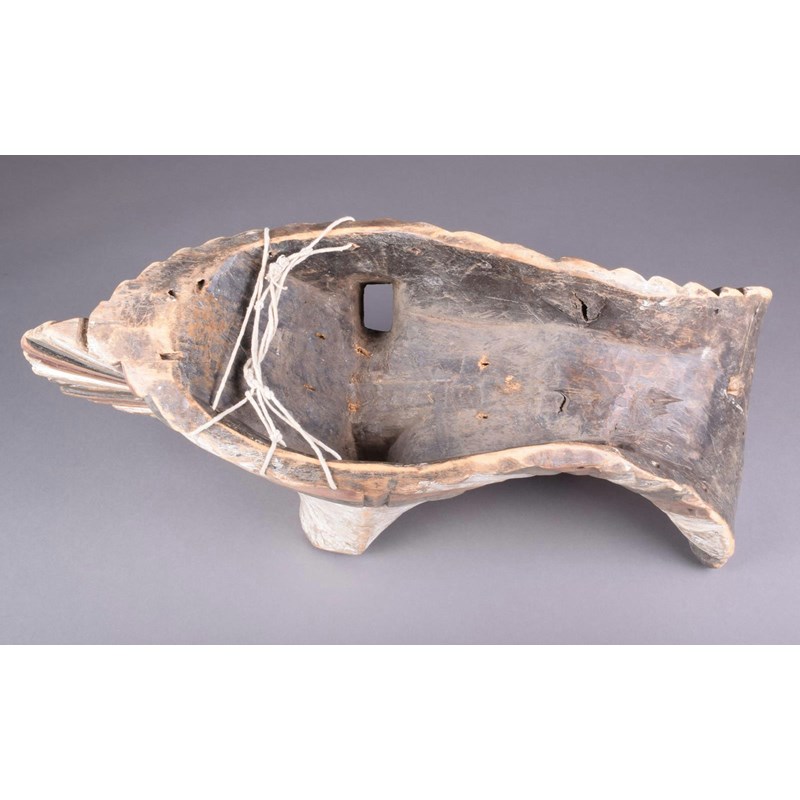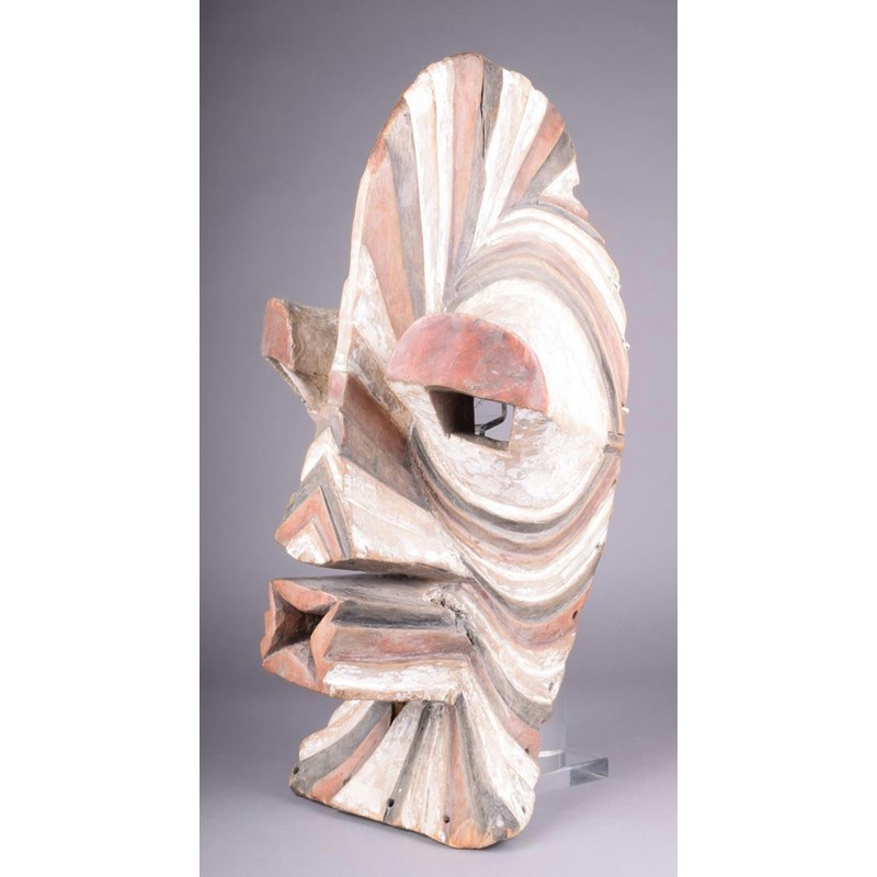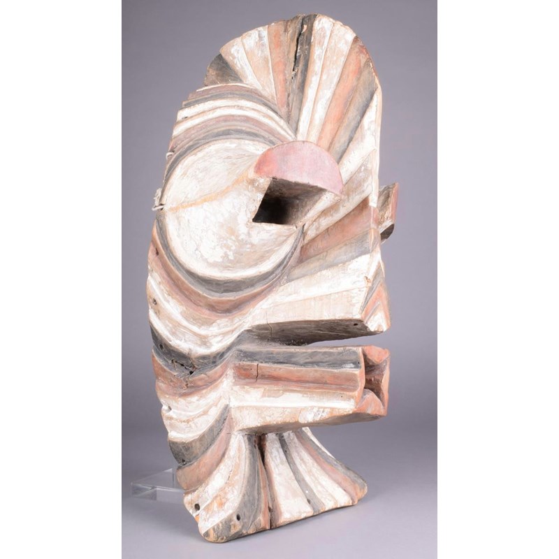 A Songye kifwebe mask, D R Congo, with angled ribbing, a central crest with extenuated eyes and mouth, 61cm high.