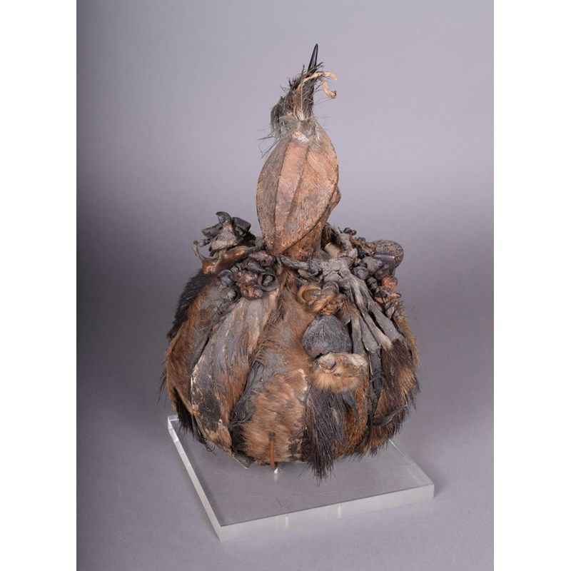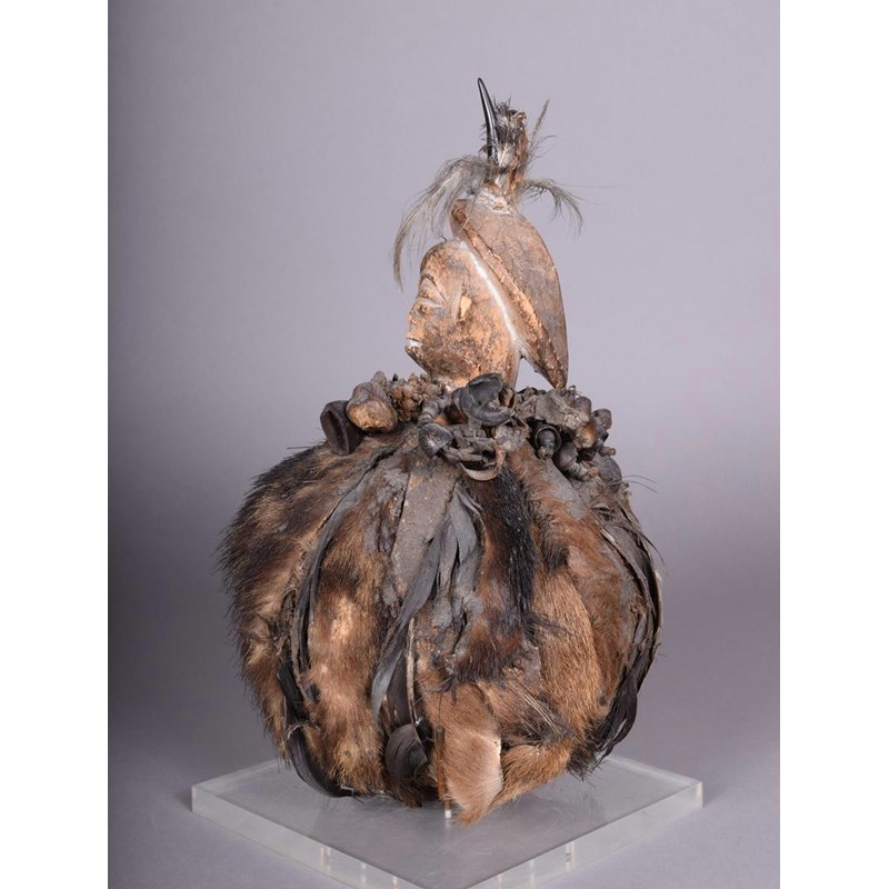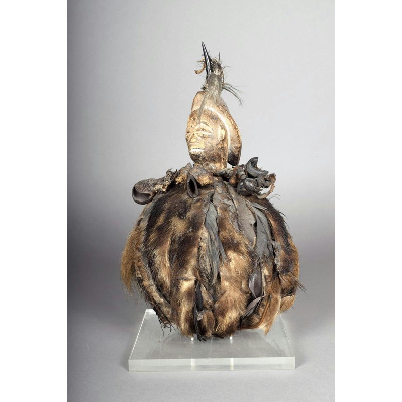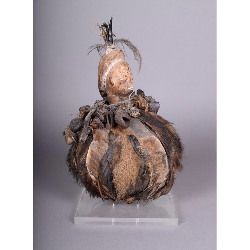 A Tsogo fetish, Gabon, with a spherical body covered in fur and feather, a necklace with bones, nut shells, a claw and fibre, with a carved head with eliptical headdress issing a horn and further feathers and fibre, 36cm high, on a perspex stand.