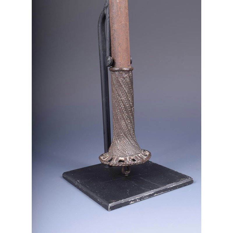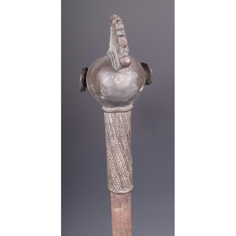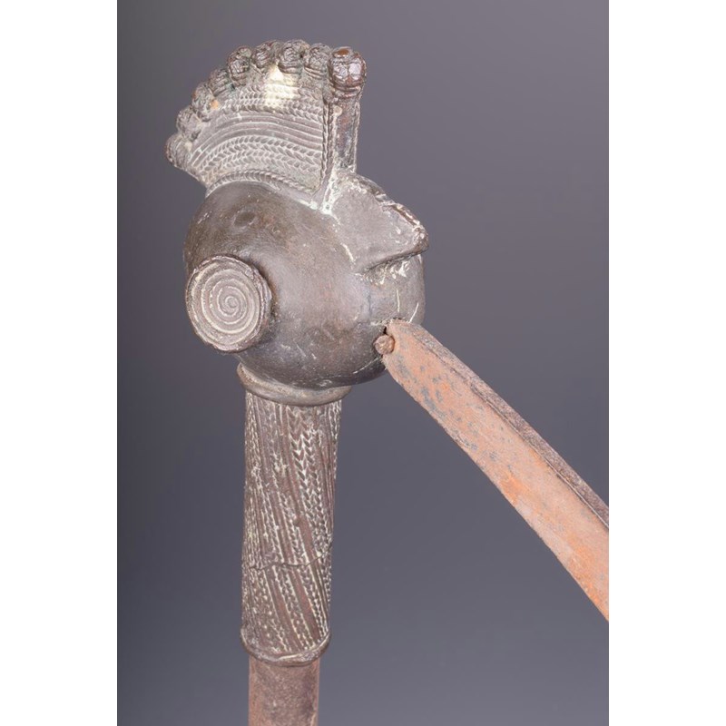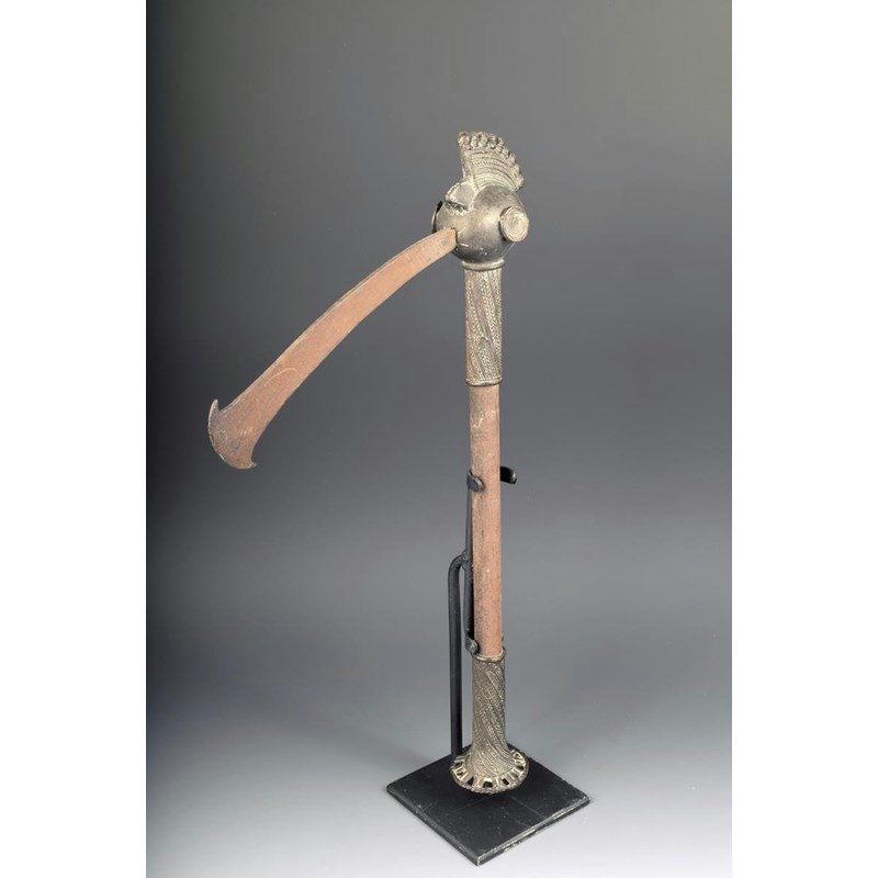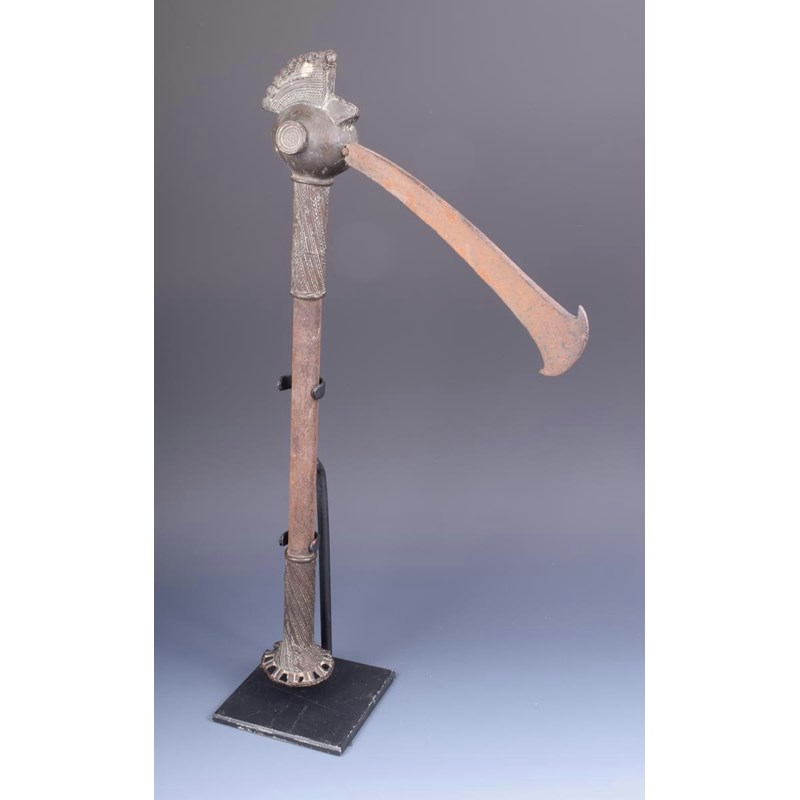 A Tiv ceremonial adze, Nigeria, brass and iron, with a stylized human head with single crest, ears and eyes, the mouth issuing a curved blade, with cast braid and line decorated collar and base with a suspension loop, 44cm high.