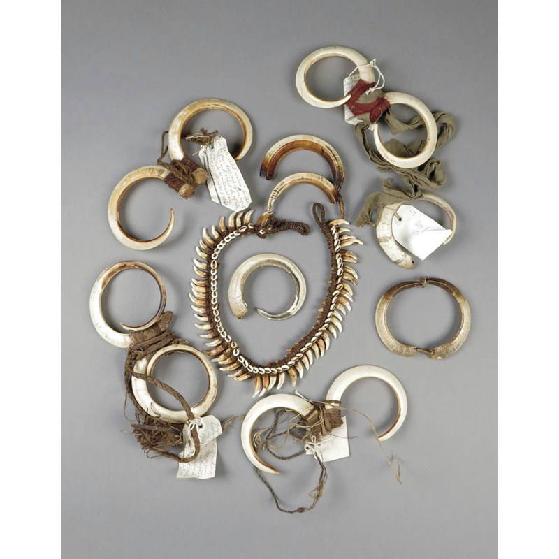Four Kilenge pig's tusk ornamants, Papua New Guinea, three fibre bound, the fourth cloth bound, the widest 22cm, a pig's tusk armband, four individual tusks and a Kilenge dog's teeth head band, with shells and fibre. (10)