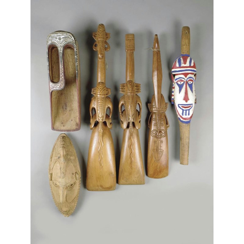 Three Tami Island sago / taro spoons, Papua New Guinea, carved figures, masks, serpents and a bird head, the longest 66cm, a Nausung carved wood and painted mask ornament, 54cm long, a Sepik mask and a Kilenge carved wood bailer, 37.5cm long. (6)