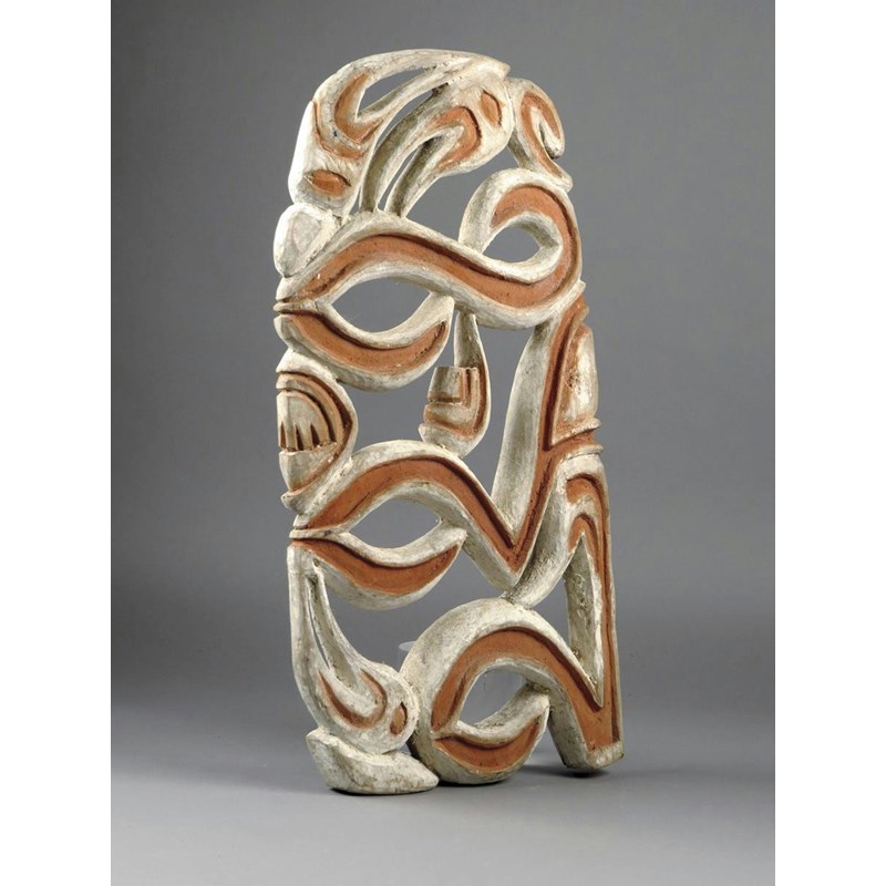 An Asmat carved wood canoe prow ornament, Papua New Guinea, with bird's heads and scrolls with white and red ochre pigment, 56cm high.