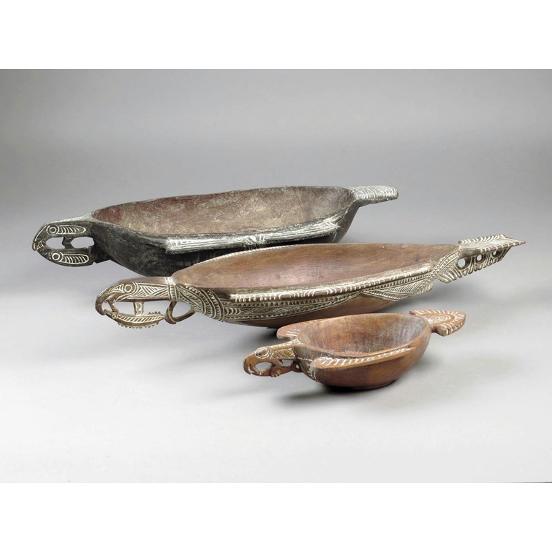 A Kilenge carved wood oval bird bowl, Papua New Guinea, with fish and lime, 57.5cm long, a Tami carved wood bird bowl, with lime and fish supports, 61cm long and a Kilenge small carved wood bird bowl, 30cm long. (3)