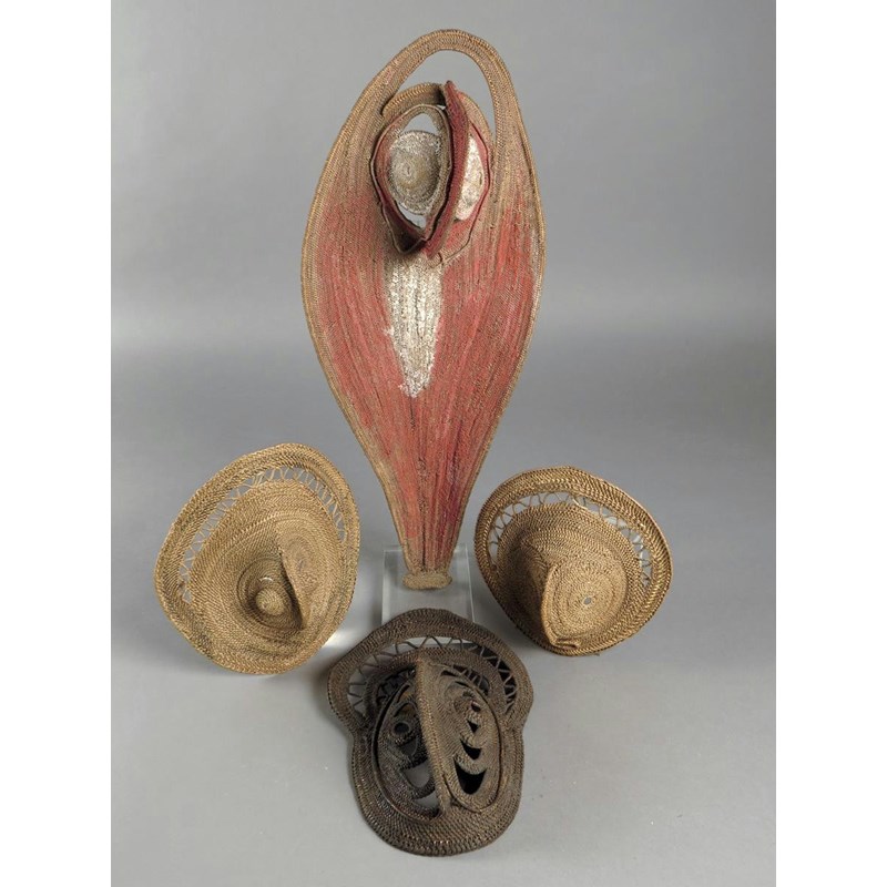 A Sepik wicker and painted yam mask, 56.5cm high, a Sepik yam mask with encrusted finish and two yam masks. (4)