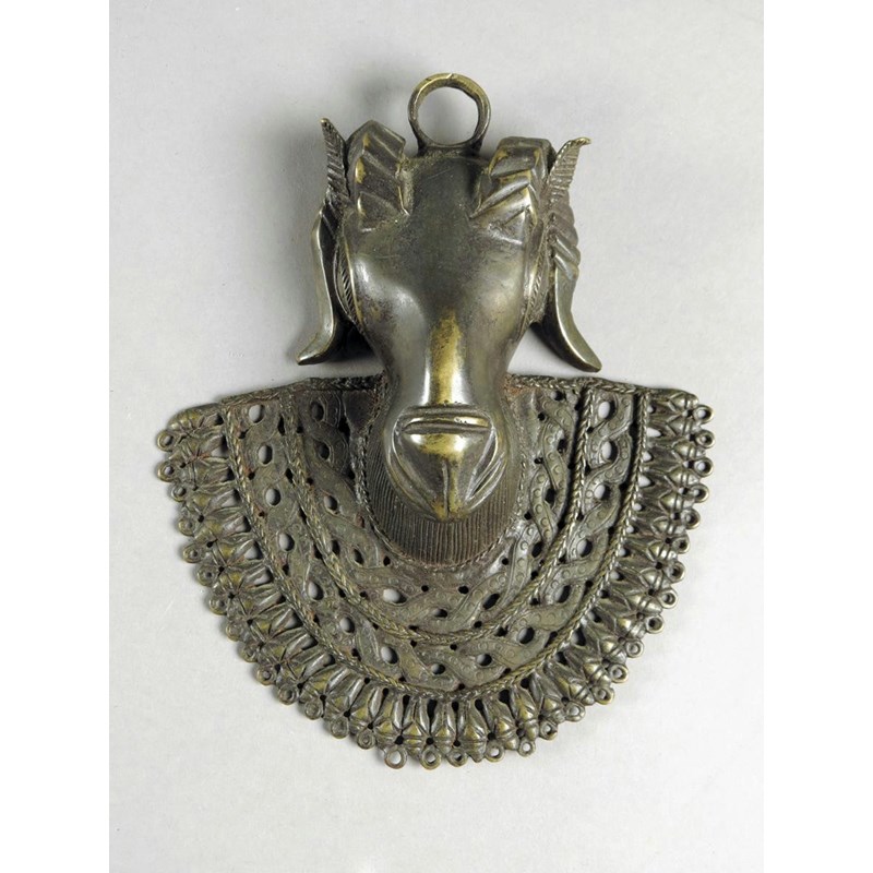 A Benin bronze hip mask, with rams head, 20.6cm wide.