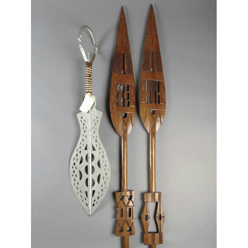 A Benin ceremonial sword, painted sheet metal with leather grip, 85cm long and two Benin carved wood bekri paddles, 160.5cm the longest. (3)