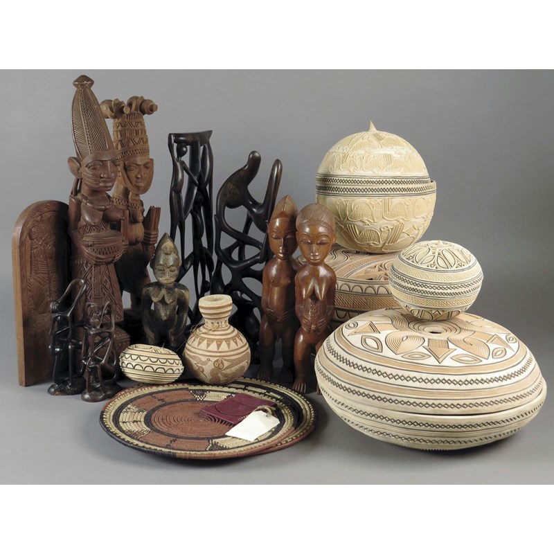 Five Nigerian carved calabashes, as a circular bowl and cover, 35.5cm diameter the largest, a carved calabash vessel, two table mats, a Yoruba carved maternity figure signed L. O. Fakeye, 51cm high, another of a male signed Gani. Fakeye, four Makonde abstract carvings, a Senufo standing female figure and a Benin style carved plaque. (a lot)