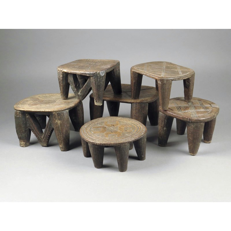 Six Nigerian wood stools, with geometric patterned tops, two with 'V' shape supports, the highest 14.5cm. (6)