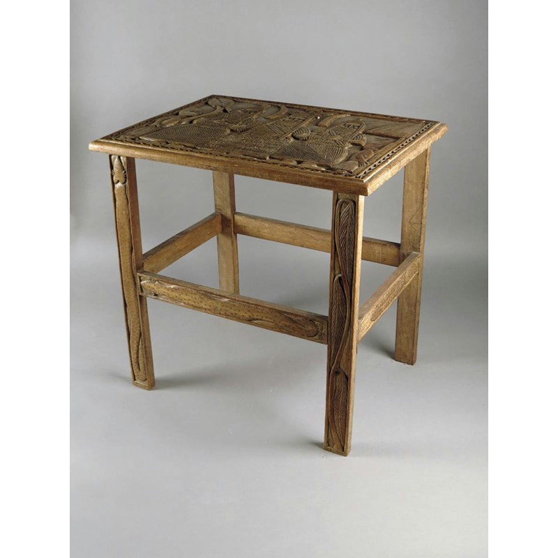 An African carved wood table, the top with Oba and two attendants and two other figures, 61cm high, 61.5cm wide.