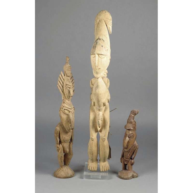 An Abelam standing male figure, Papua New Guinea, wearing a headdress, 66.5cm high, and two Sepik carved wood ancestor figures. (3)
