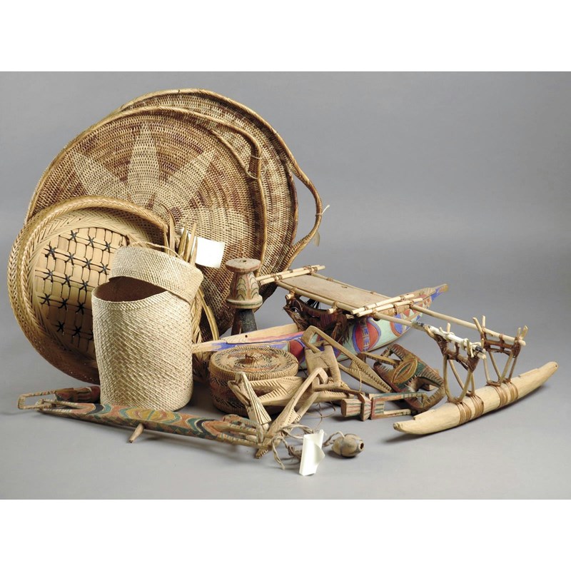 A Kilenge model canoe, Papua New Guinea, 14cm high, a Kilenge carved and stained wood house ornament, 27cm high, two other carved ornaments, two Buku woven trays, a Philippines bamboo and rattan tray, a woven basket and cover, a Kilenge whistling toy and palm frond woven ornaments. (a lot)
