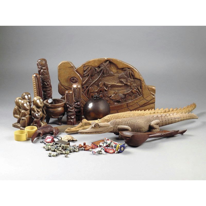 Two Manus Island carved wood crocodiles, Papua New Guinea, 53.5cm and 61cm long, other carved figures, a small group of Njigerian decorated beads, two wire and bead dolls. (a lot)